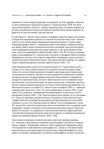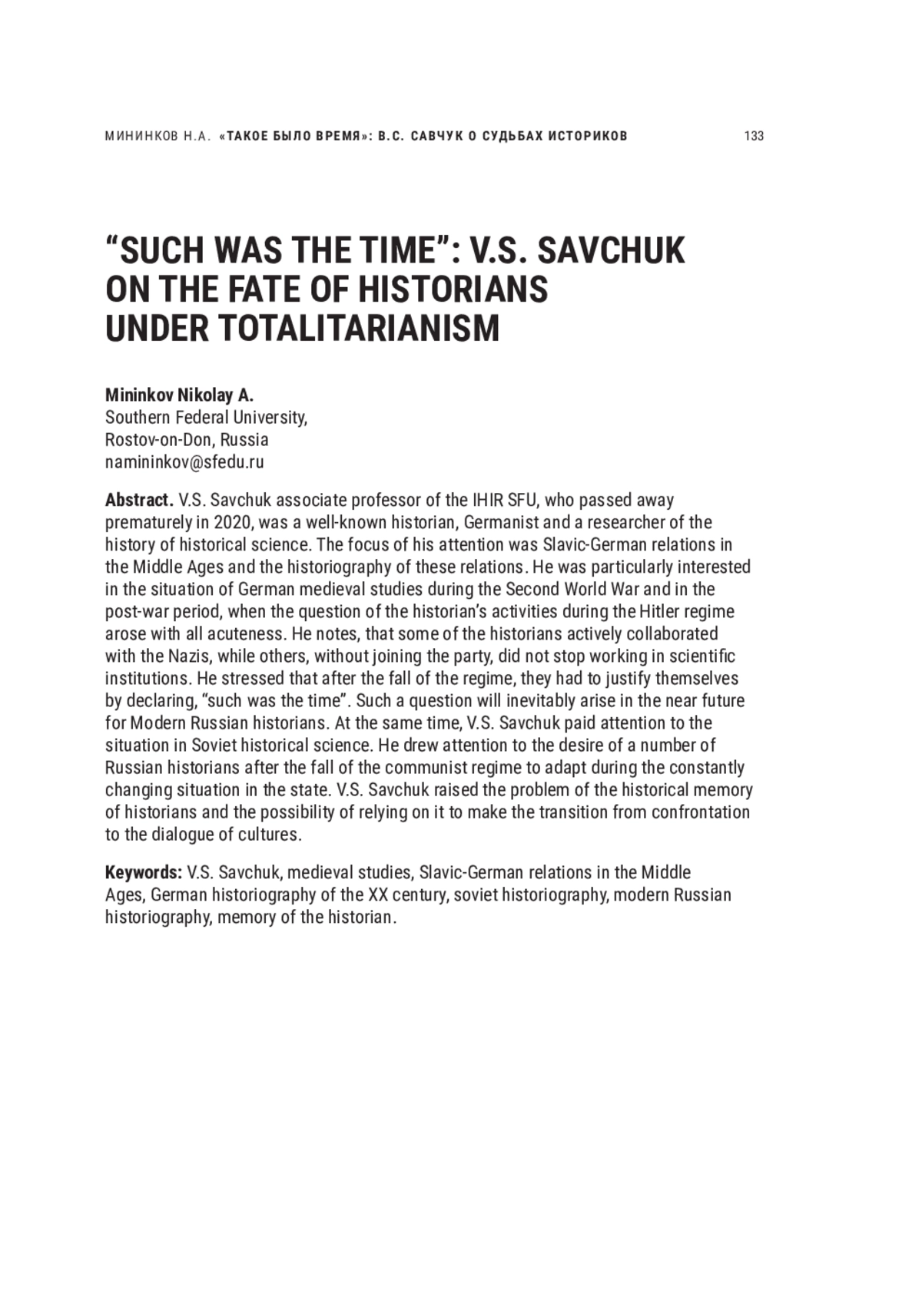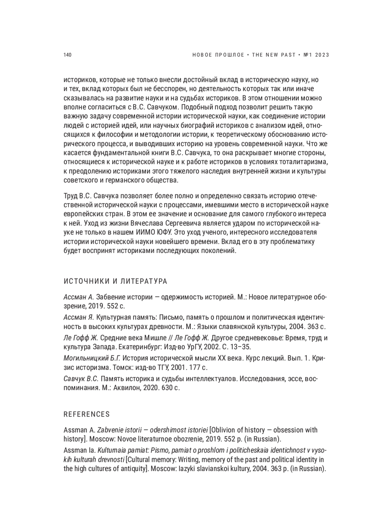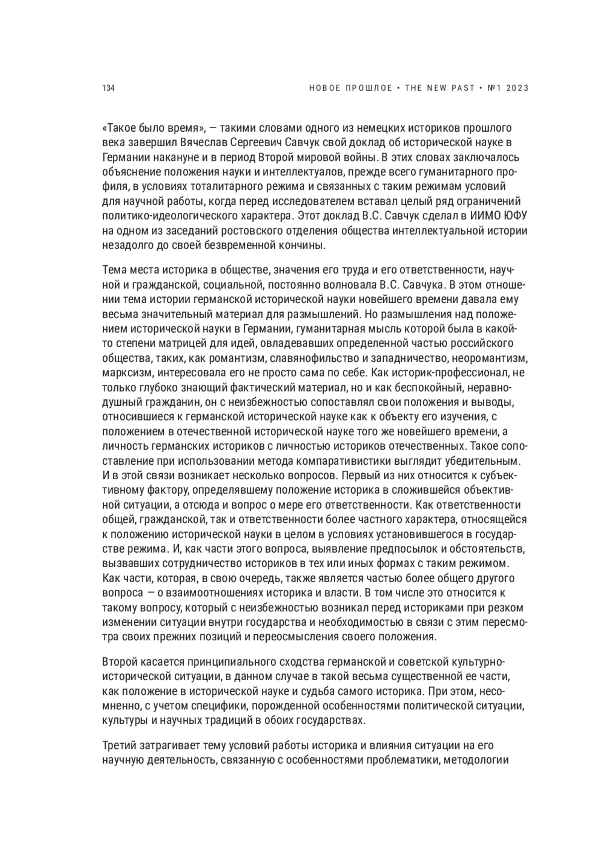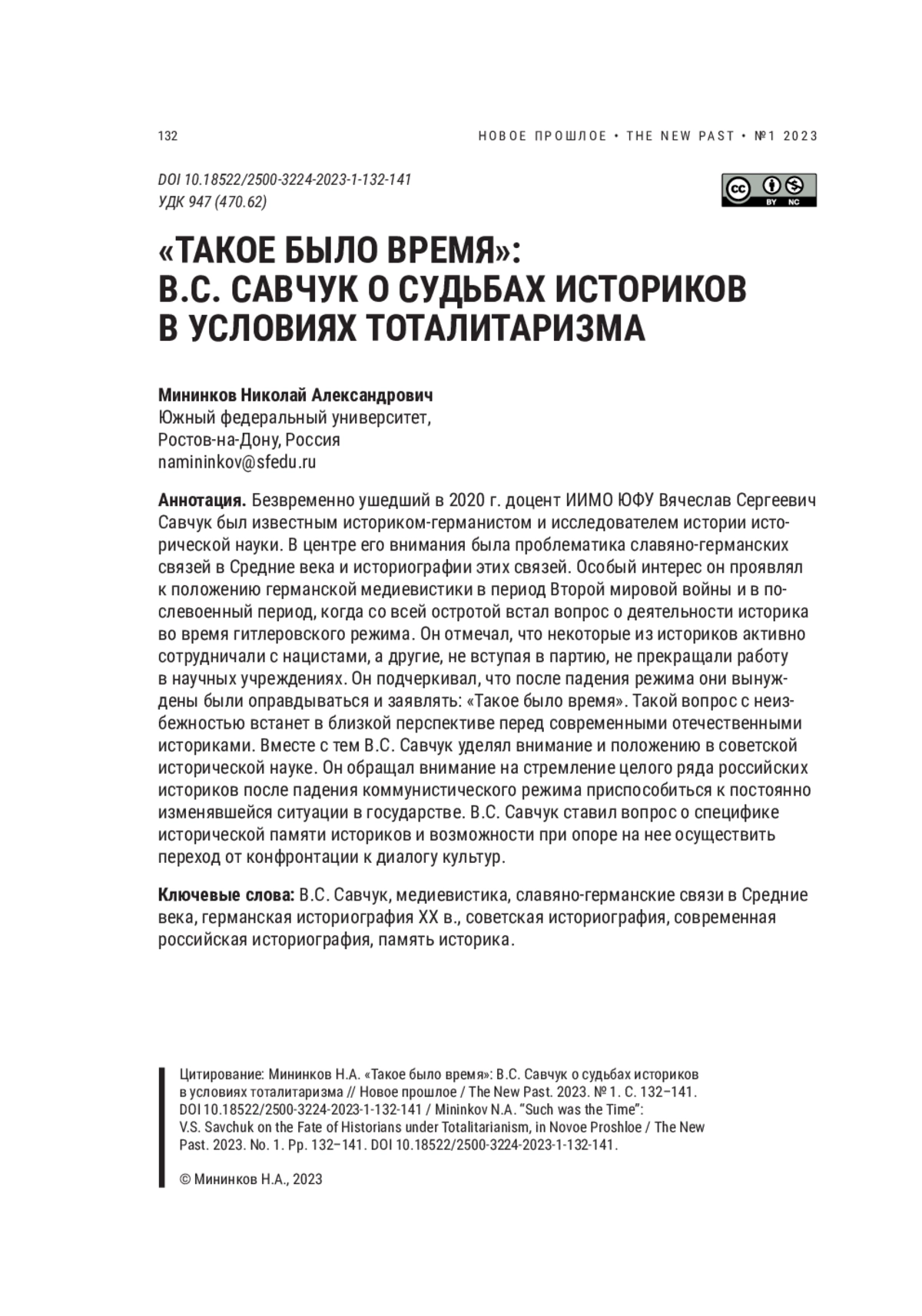 МИНИНКОВ Н. А. "ТАКОЕ БЫЛО ВРЕМЯ": В. С. САВЧУК О СУДЬБАХ ИСТОРИКОВ В УСЛОВИЯХ ТОТАЛИТАРИЗМА // НОВОЕ ПРОШЛОЕ. 2023. № 1