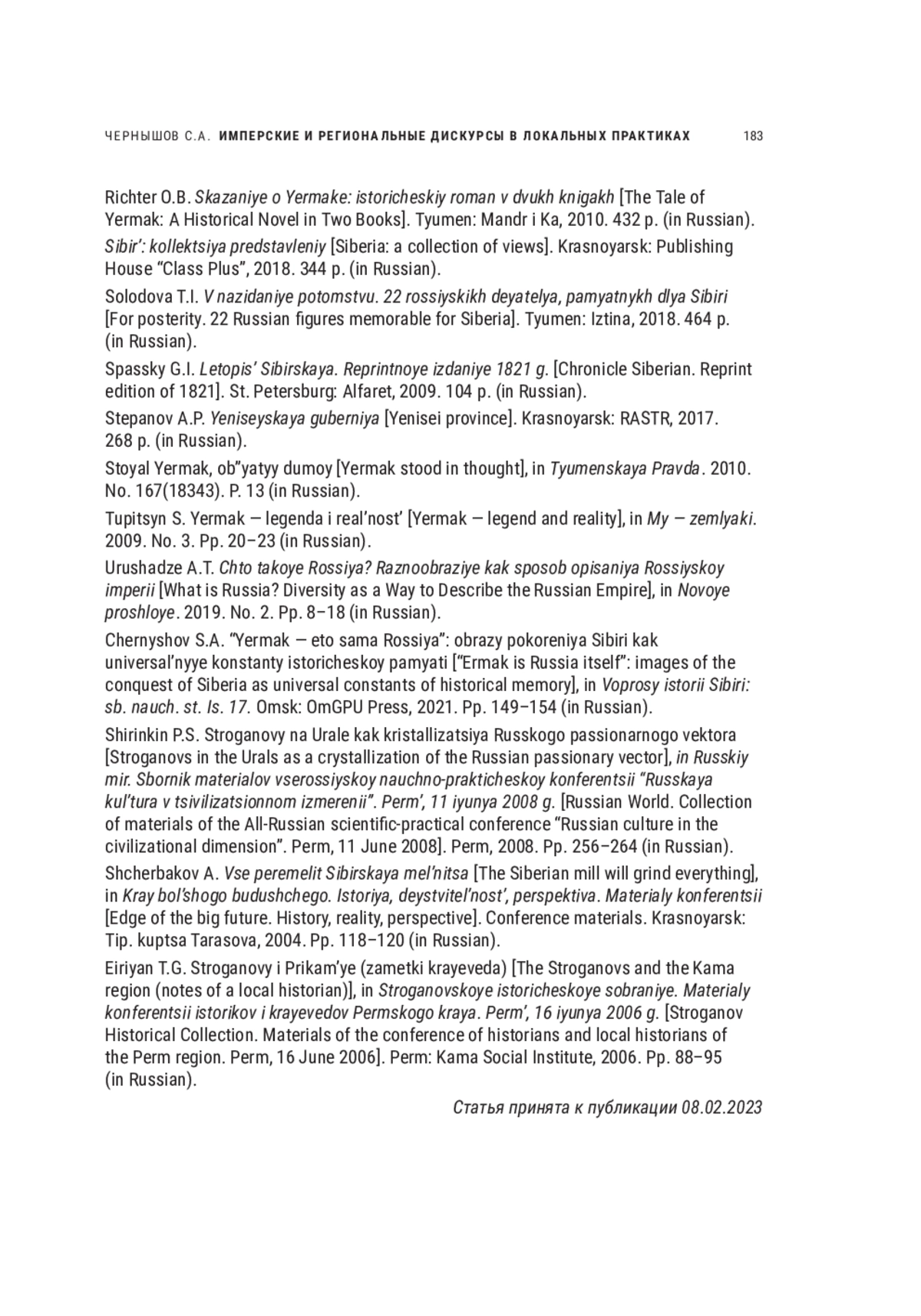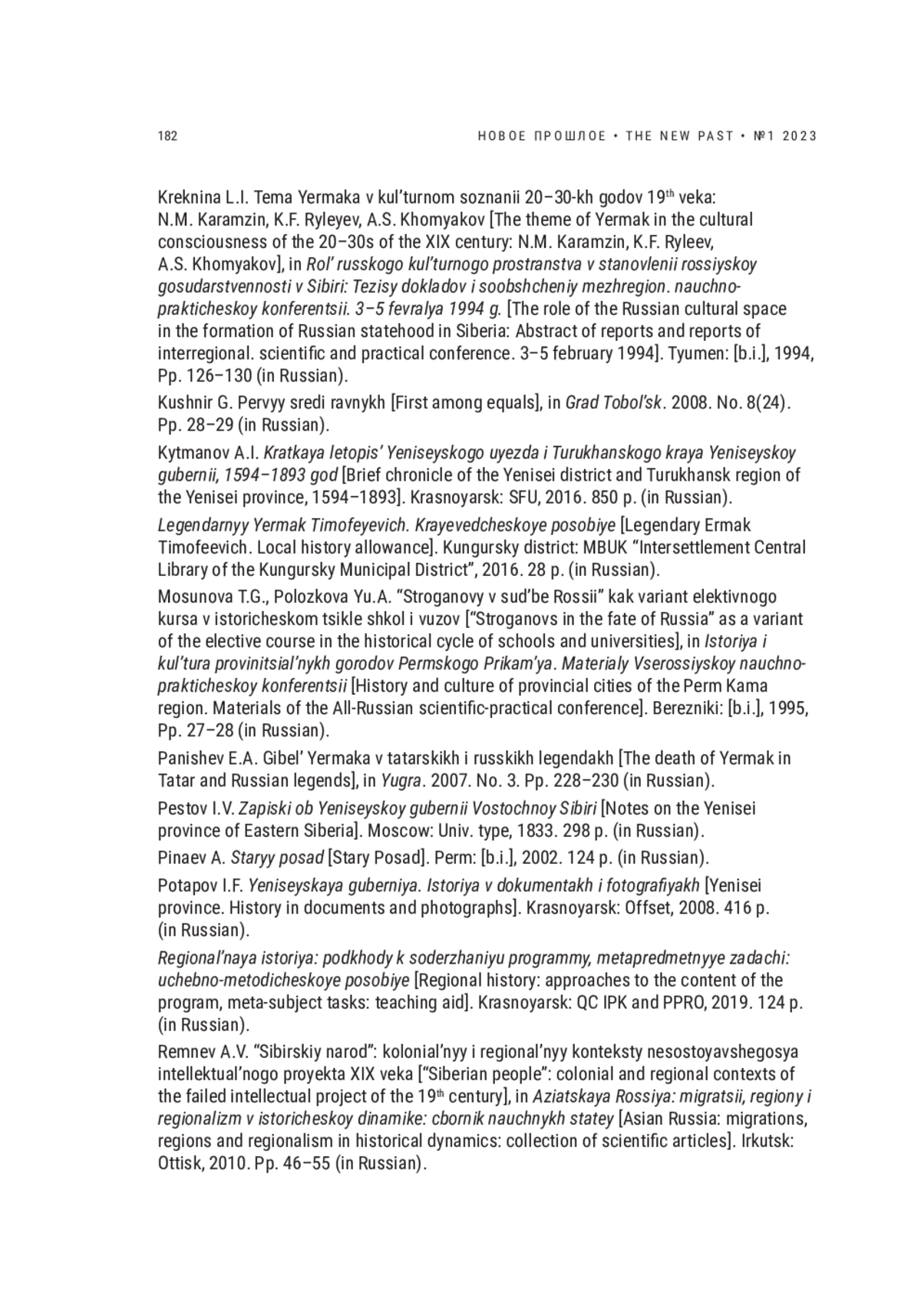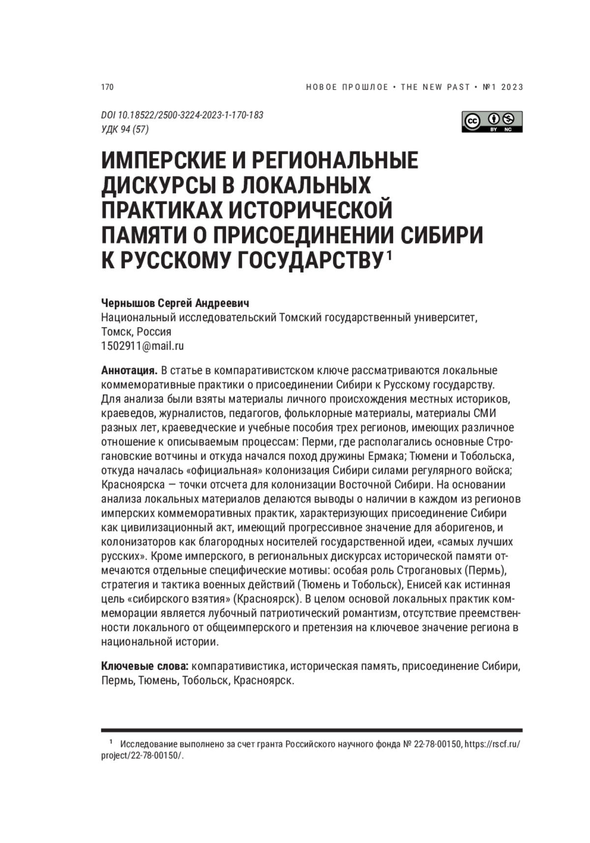 ЧЕРНЫШОВ С. А. ИМПЕРСКИЕ И РЕГИОНАЛЬНЫЕ ДИСКУРСЫ В ЛОКАЛЬНЫХ ПРАКТИКАХ ИСТОРИЧЕСКОЙ ПАМЯТИ О ПРИСОЕДИНЕНИИ СИБИРИ К РУССКОМУ ГОСУДАРСТВУ // НОВОЕ ПРОШЛОЕ. 2023. № 1