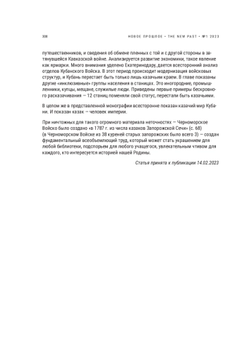 В статье анализируется книга известных специалистов по истории казачества А. П. Скорика и И. М. Фединой «Кубанские курени и станицы. Повседневный поселенческий уклад кубанских казаков и исторические формы поселений на Кубани в конце XVIII–первой трети ХХ веков», опубликованная в Новочеркасске в 2022 г. Монография представляет сбой объемный труд в 1336 страниц, представляющий собой энциклопедию кубанской станицы и «кубанской жизни» как явления. Авторами выдвигается историко-пространственная концепция «казачий мир Кубани». Ключевым звеном научного поиска, выявляющего пути заселения, освоения и развития территории нынешнего Краснодарского края, является история формирования казачьих поселений на Кубани. Автор статьи вписывает новый труд в уже имеющуюся богатую историографию Кубани периода империи