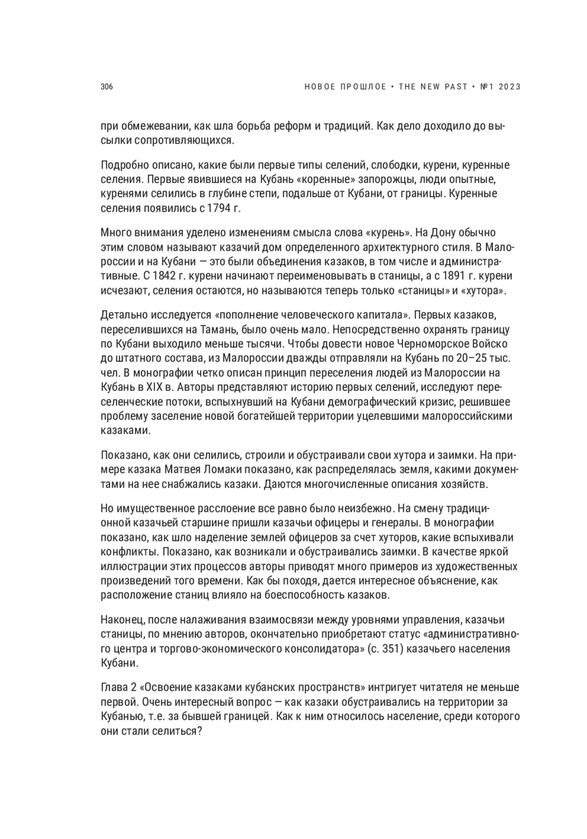 В конце 2022 г. вышла интереснейшая книга А. П. Скорика и И. М. Фединой «Кубанские курени и станицы. Повседневный поселенческий уклад кубанских казаков и исторические формы поселений на Кубани в конце XVIII — первой трети ХХ веков» (Новочеркасск: Лик, 2022, 1336 с.), которая, безусловно, станет историографическим событием на Юге России и, возможно, в целом по стране. А. П. Скорик возглавляет НИИ истории казачества и развития казачьих регионов в Южно-Российском государственном политехническом университете (НПИ) имени М. И. Платова, и фундаментальное исследование кубанских куреней и станиц имеет прямое отношение и к истории казачества, и к развитию казачьих регионов. Это своего рода маркер названного нами НИИ