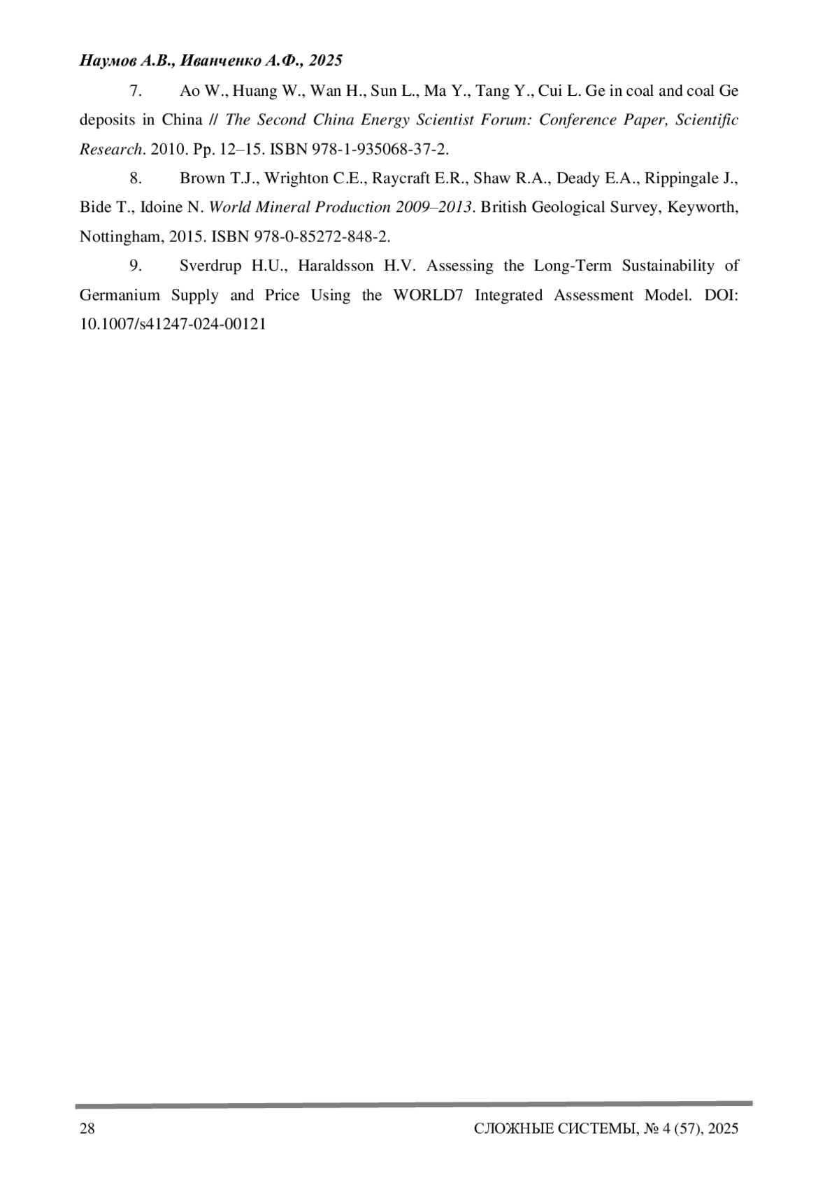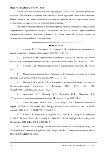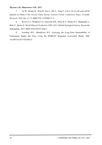 The article examines the organization of germanium production in the Russian Federation from the perspective of a system approach. The problem is classified as a weakly structured issue within a sociotechnical system: decisions are made with incomplete data and rely on expert assessments. The paper describes the stages of system analysis, provides a brief historical overview of the industry, and characterizes the raw material base and germanium extraction technologies. Key application areas of the element are listed: infrared optics, fiber-optic communication lines, photovoltaics, electronics, and defense technologies. The study identifies barriers to the industry’s development in Russia and proposes systemic solutions: developing new deposits, modernizing production facilities, recycling secondary resources, and establishing a closed value chain.