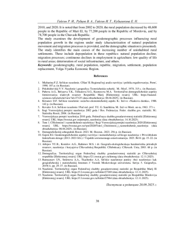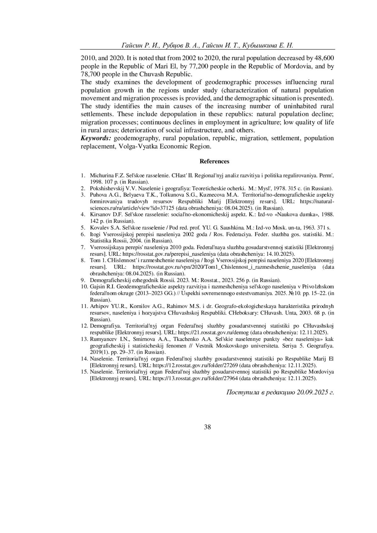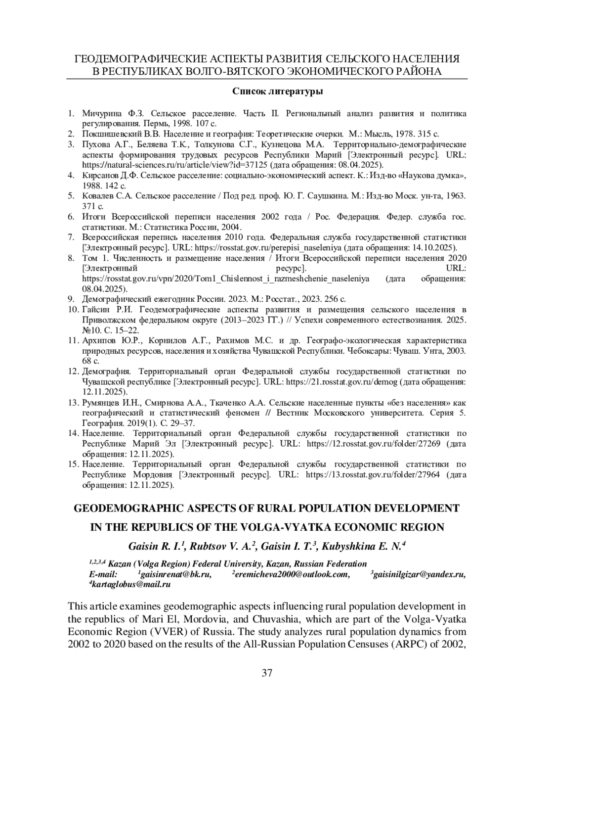 10. Гайсин Р.И. Геодемографические аспекты развития и размещения сельского населения в Приволжском федеральном округе (2013-2023 ГГ.) // Успехи современного естествознания. 2025. №10. С. 15-22.