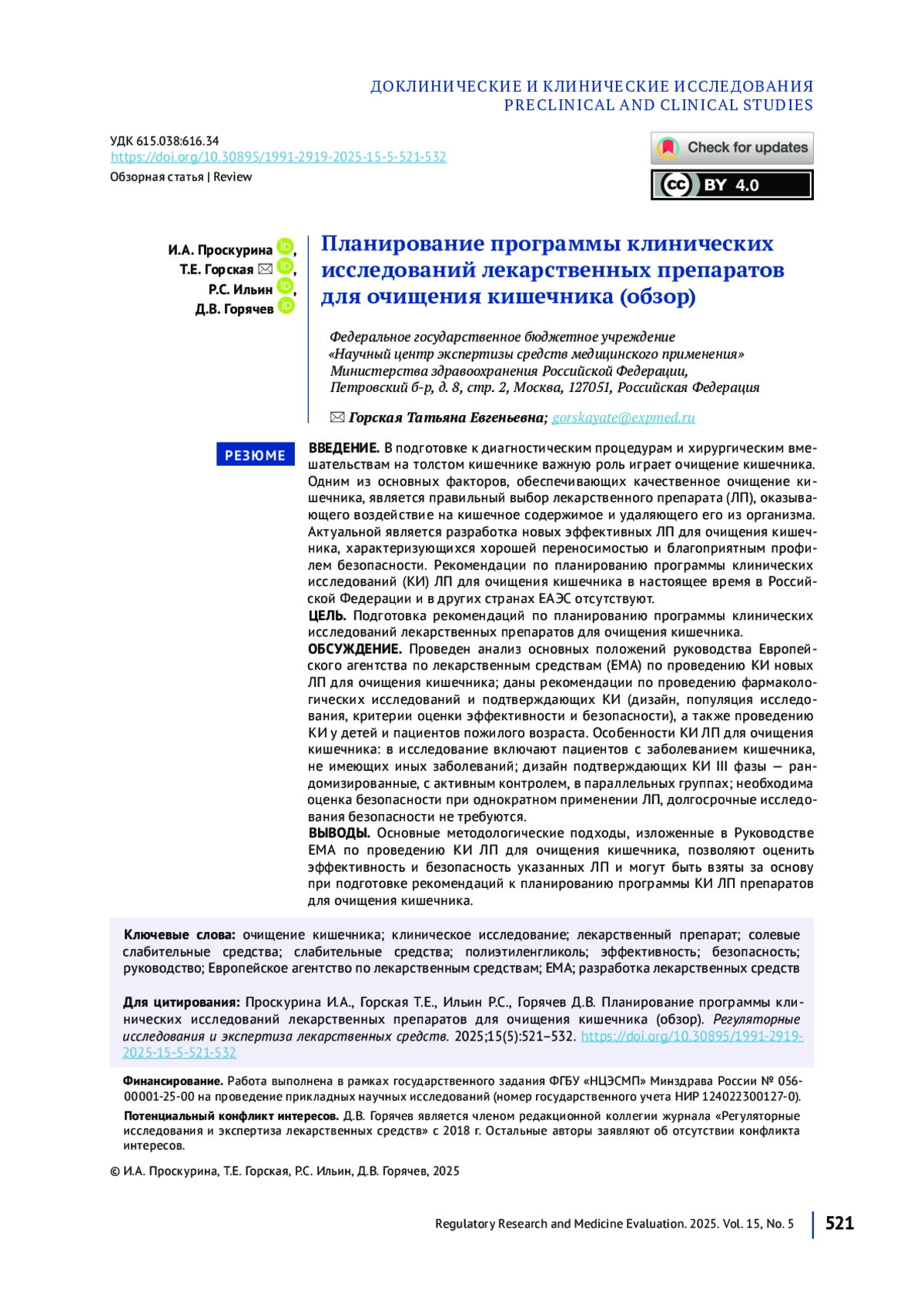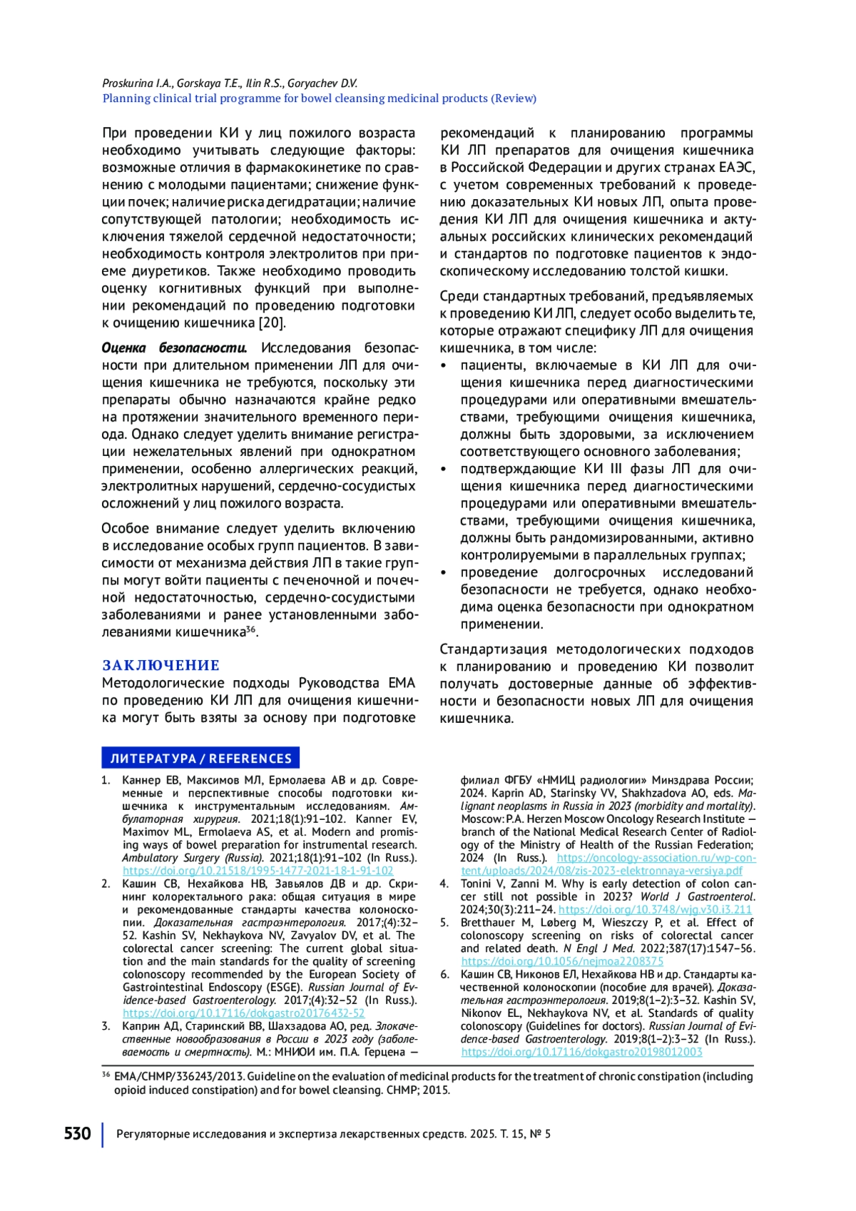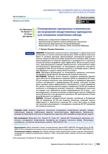ОБСУЖДЕНИЕ. Проведен анализ основных положений руководства Европейского агентства по лекарственным средствам (EMA) по проведению КИ новых ЛП для очищения кишечника; даны рекомендации по проведению фармакологических исследований и подтверждающих КИ (дизайн, популяция исследования, критерии оценки эффективности и безопасности), а также проведению КИ у детей и пациентов пожилого возраста. Особенности КИ ЛП для очищения кишечника: в исследование включают пациентов с заболеванием кишечника, не имеющих иных заболеваний; дизайн подтверждающих КИ III фазы — рандомизированные, с активным контролем, в параллельных группах; необходима оценка безопасности при однократном применении ЛП, долгосрочные исследования безопасности не требуются.