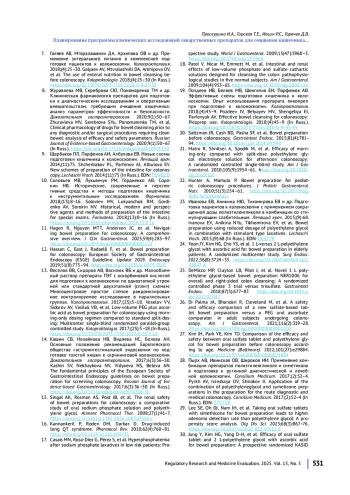 43. Вологжанина ЛГ, Игумнова ОА, Петухова ИВ, Санников ПК. Эффективная подготовка кишечника к скрининговой колоноскопии. Колопроктология. 2020;19(3):65-71. DOI: 10.33878/2073-7556-2020-19-3-65-71