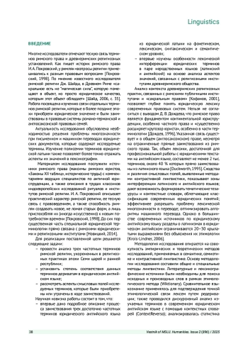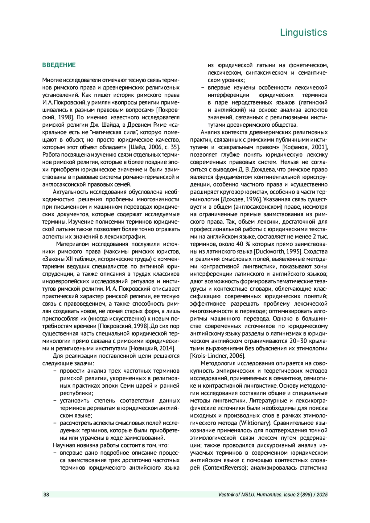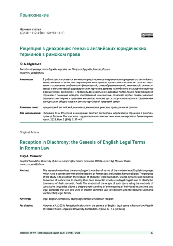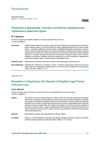 В работе рассматривается этимология ряда терминов современного юридического английского языка, имеющих связь с институтами римского права и древнеримской религии. Цель исследования - установить особенности фонетической, словообразовательной, лексической, синтаксической и семантической деривации таких терминов, выявить их глубинную смысловую структуру в юридическом английском и прояснить доминанты их смысловых полей. Анализ происхождения терминов с помощью методов контрастивной лингвистики позволяет глубже понять значение отдельных институтов и правовых концептов, которые до сих пор используются в современных юрисдикциях общего права и романо-германской правовой семьи.