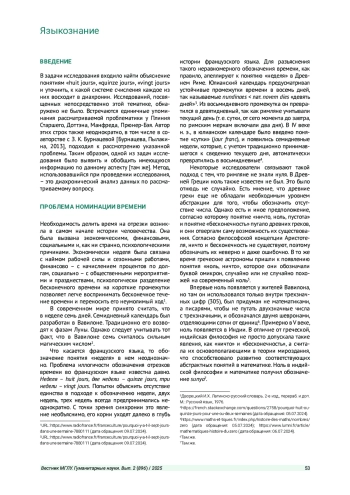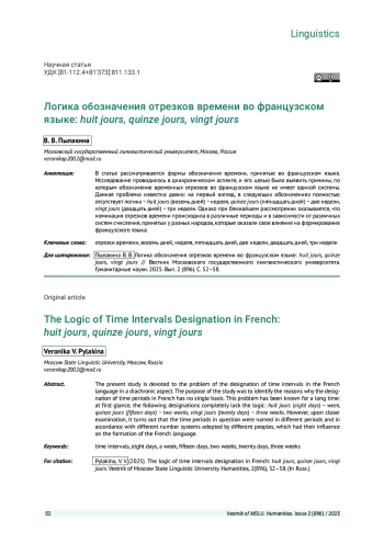 В статье рассматриваются формы обозначения времени, принятые во французском языке. Исследование проводилось в диахроническом аспекте, и его целью было выявить причины, по которым обозначение временных отрезков во французском языке не имеет единой системы. Данная проблема известна давно: на первый взгляд, в следующих обозначениях полностью отсутствует логика - huit jours (восемь дней) - неделя, quinze jours (пятнадцать дней) - две недели, vingt jours (двадцать дней) - три недели. Однако при ближайшем рассмотрении оказывается, что номинация отрезков времени происходила в различные периоды и в зависимости от различных систем счисления, принятых у разных народов, которые оказали свое влияние на формирование французского языка.