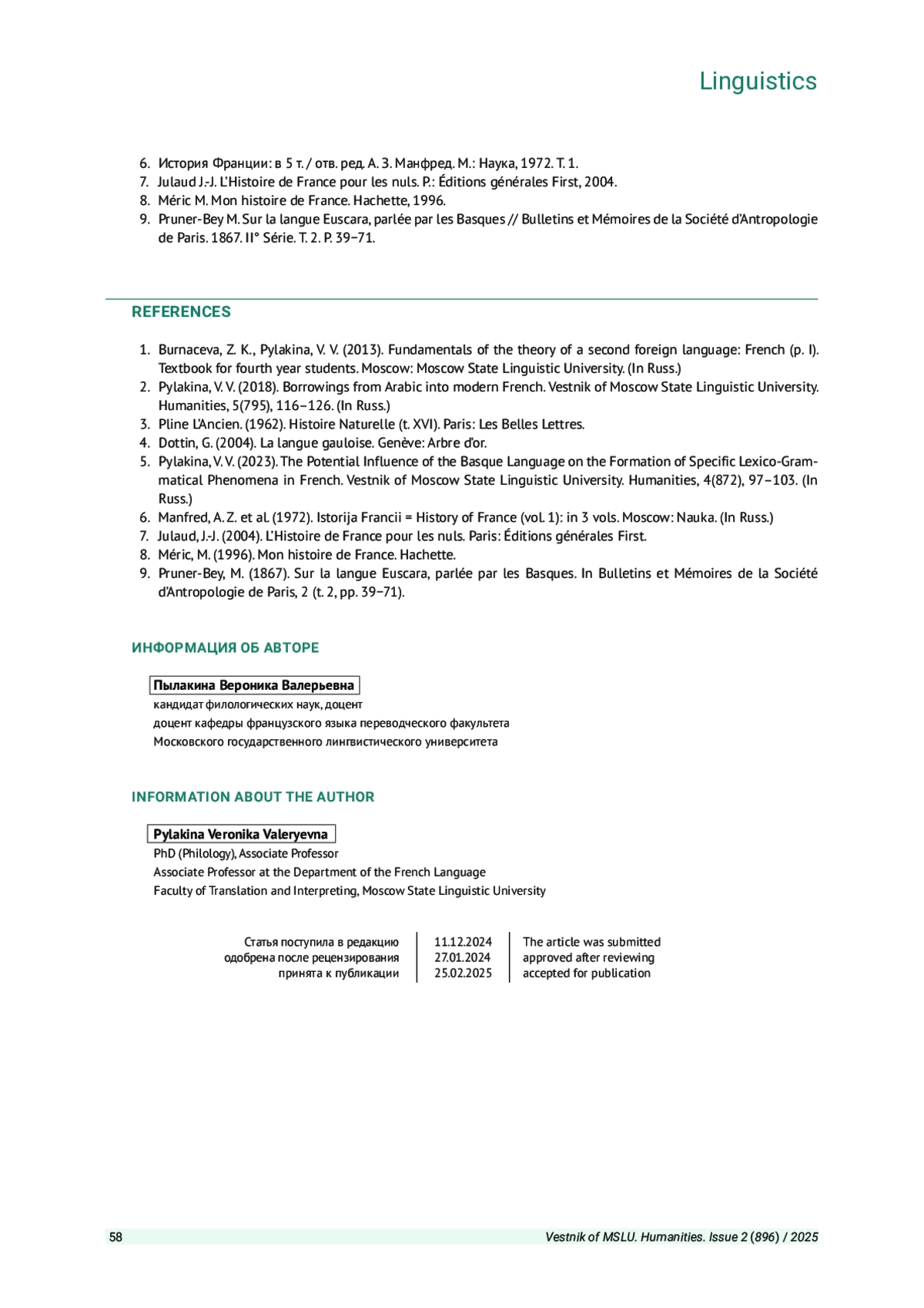 5. Пылакина В. В. Потенциальное влияние баскского языка на формирование специфических лексико-грамматических явлений во французском языке // Вестник Московского государственного лингвистического университета. Гуманитарные науки. 2023. Вып. 4 (872). С. 97-103. EDN: BOVKPZ