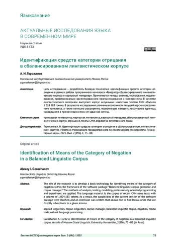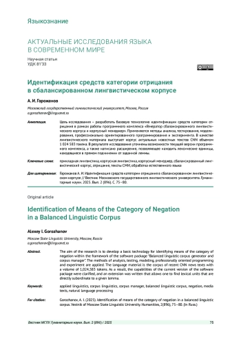 Цель исследования - разработать базовую технологию идентификации средств категории отрицания в рамках работы программного комплекса «Генератор сбалансированного лингвистического корпуса и корпусный менеджер». Применяются методы анализа, тестирования, моделирования, профессионально ориентированного программирования и эксперимента. В качестве лингвистического материала выступает корпус актуальных новостных текстов CNN объемом 1 024 583 токена. В результате исследования уточнены возможности текущей версии программного комплекса, а также написано расширение, позволяющее находить лексические единицы, находящиеся в прямом подчинении от заданной леммы.