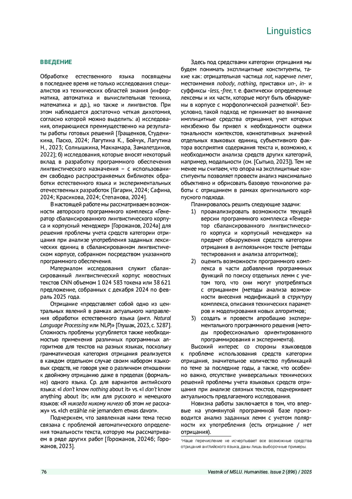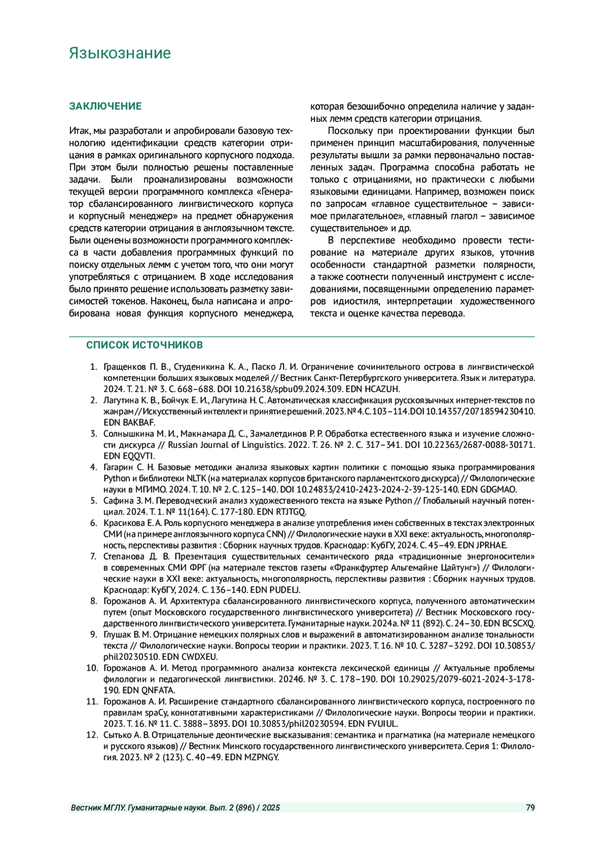 10. Горожанов А. И. Метод программного анализа контекста лексической единицы // Актуальные проблемы филологии и педагогической лингвистики. 2024б. № 3. С. 178-190. DOI: 10.29025/2079-6021-2024-3-178-190 EDN: QNFATA
