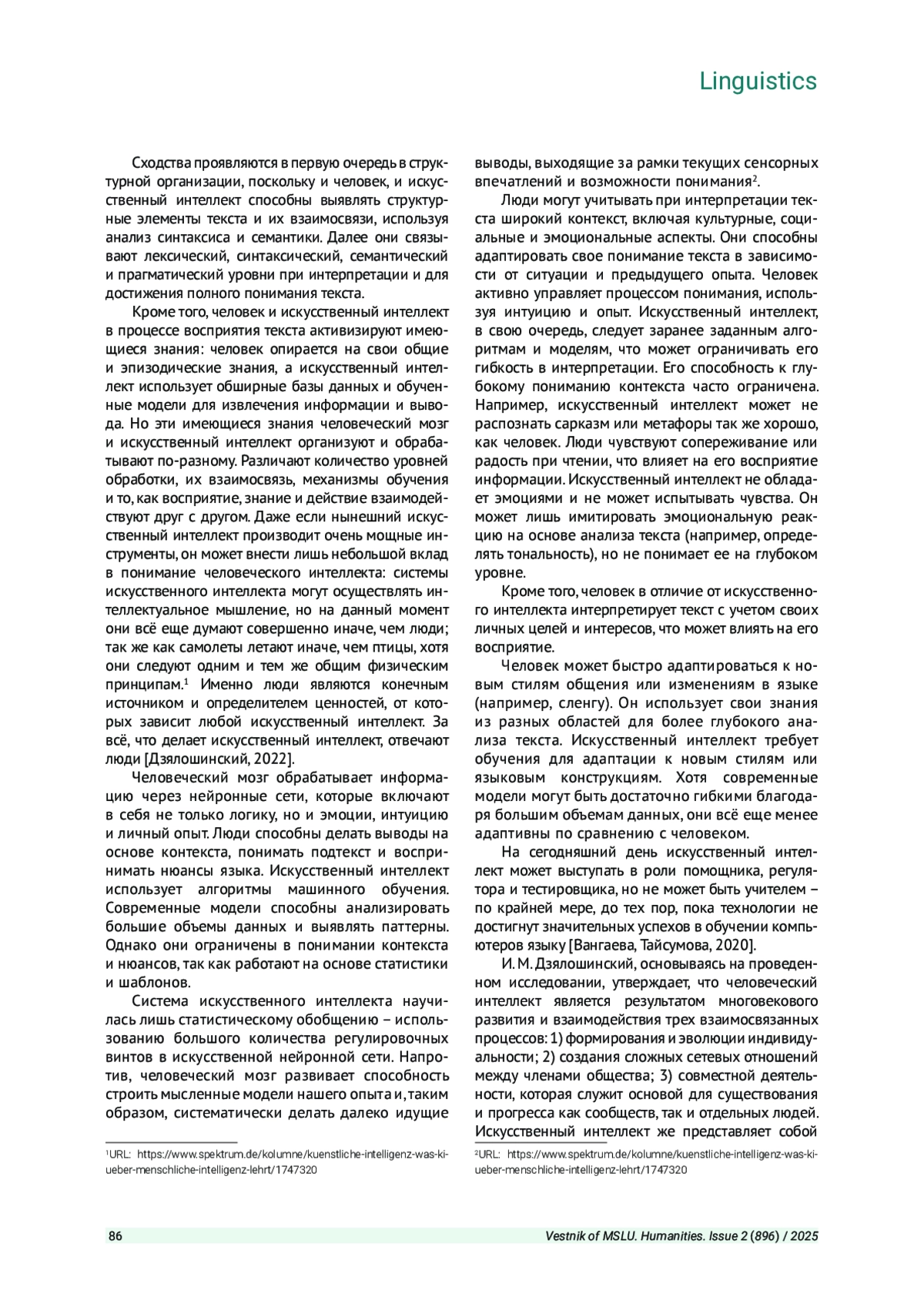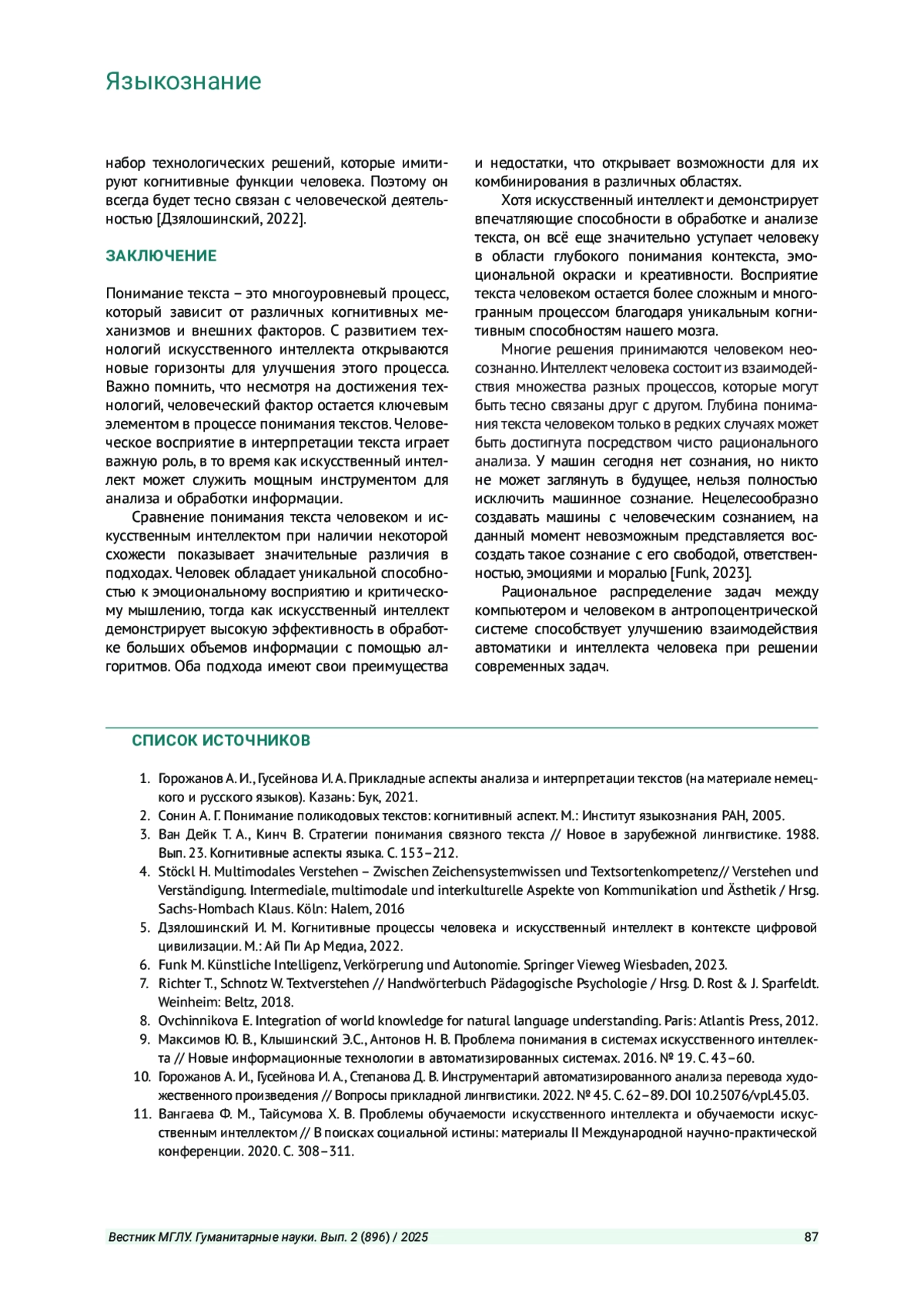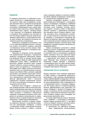 В последние десятилетия на пересечении когнитивной лингвистики и информационных технологий возникло новое поле исследований, изучающее понимание текста. С развитием искусственного интеллекта и машинного обучения способность компьютера интерпретировать язык, с одной стороны, открыла новые горизонты в области обработки естественного языка, с другой – поставила вопрос о том, насколько эта способность приближается к пониманию текста человеком или отличается от него. Этот вопрос особенно актуален, когда рассматриваются субъективные и контекстуальные аспекты языка, которые часто являются источником значительных различий в интерпретации.