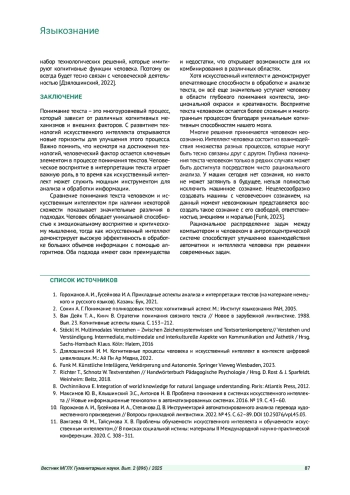 Цель исследования - систематизация и обобщение когнитивного процесса понимания текста человеком и искусственным интеллектом. В статье проводится сравнительный анализ с использованием конкретной модели понимания текста, обосновывается важность контекста и субъективного восприятия. Психолингвистический анализ помогает описать когнитивные процессы понимания текста человеком. Компьютерный анализ дает описание алгоритмов машинного обучения и искусственных нейронных сетей. В результате сравнительного анализа выявляется, что понимание текста человеком включает в себя не только рациональный анализ, но и культурный, эмоциональный и индивидуальный опыт. Человек в отличие от искусственного интеллекта способен к более глубокой интерпретации семантического и эмоционального содержания текста.