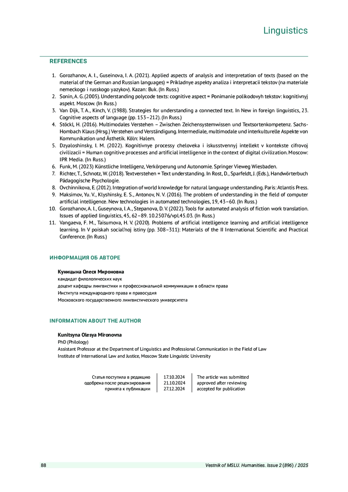 1. Горожанов А. И., Гусейнова И. А. Прикладные аспекты анализа и интерпретации текстов (на материале немецкого и русского языков). Казань: Бук, 2021. EDN: UNZHVK