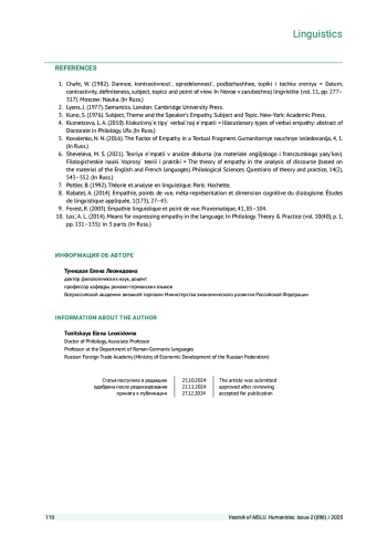 6. Шевелева М. С. Теория эмпатии в анализе дискурса (на материале английского и французского языков) // Филологические науки. Вопросы теории и практики. 2021. Т. 14. Вып. 2. С. 543-552. EDN: HZOOLO