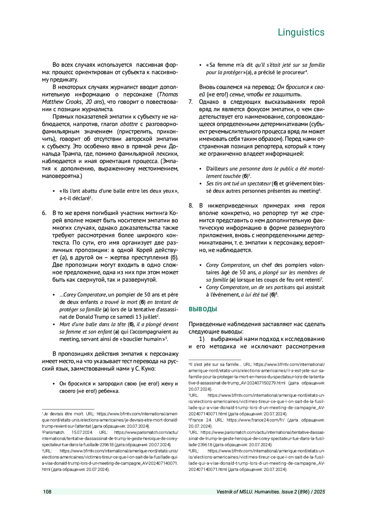 В статье лингвопрагматической направленности анализируется употребление термина «эмпатия говорящего» в современной отечественной и зарубежной лингвистике. Анализ имеет целью уточнить понимание данного термина, доказать его научную релевантность для лингвопрагматического описания и показать механизм реализации эмпатии говорящего во французском дискурсе, т. е. выявить ее языковые маркеры. Исследование выполнено на материале медиадискурса: ряда французских интернет-сообщений об одном событии (покушение на Дональда Трампа). В основе анализа лежит метод структурно-семантического сопоставления пропозиций, преобладающих в исследуемом материале. Это позволило не только уточнить понимание данного термина в лингвопрагматике, но и выявить языковые маркеры анализируемого явления во французском медиадискурсе, а также показать роль широкого контекста в его реализации.