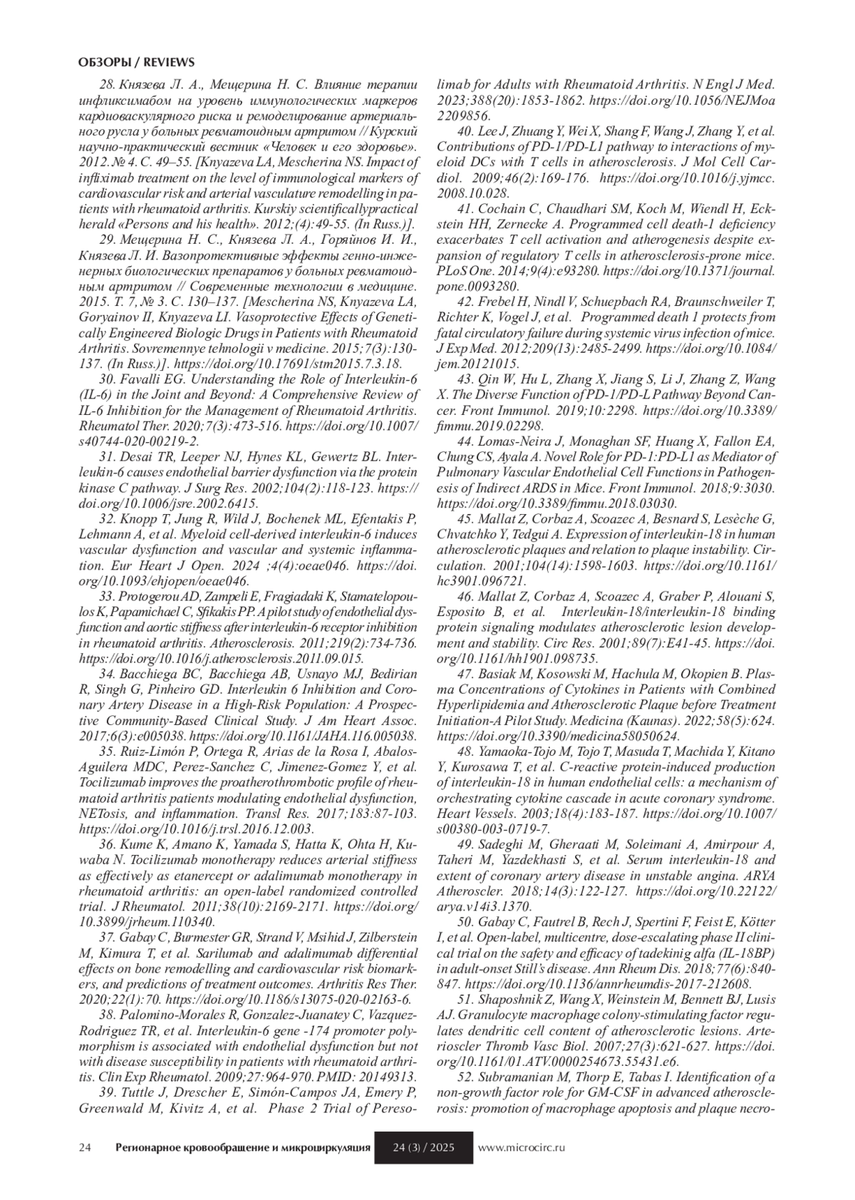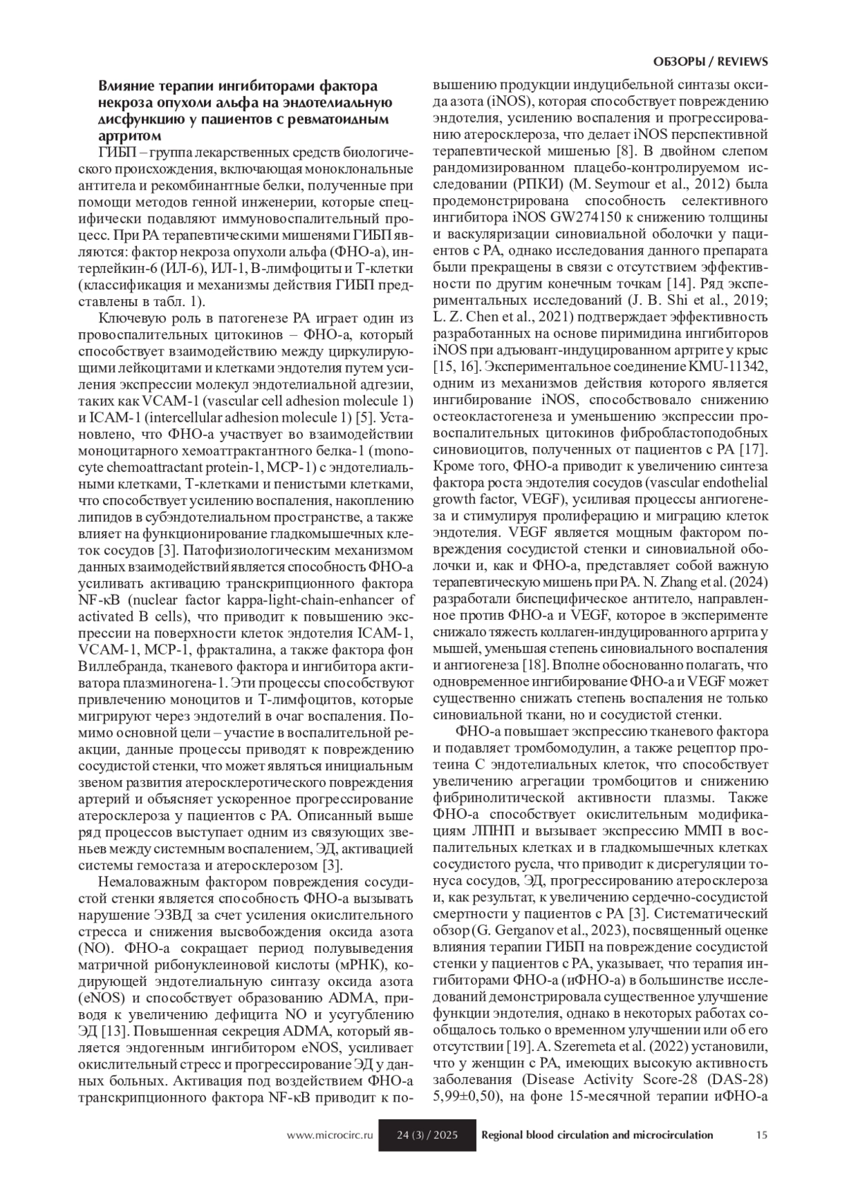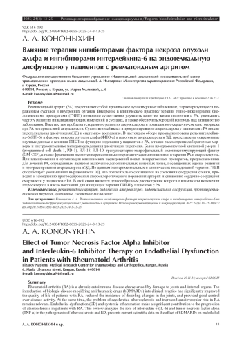 КОНОНЫХИН А. А. ВЛИЯНИЕ ТЕРАПИИ ИНГИБИТОРАМИ ФАКТОРА НЕКРОЗА ОПУХОЛИ АЛЬФА И ИНГИБИТОРАМИ ИНТЕРЛЕЙКИНА-6 НА ЭНДОТЕЛИАЛЬНУЮ ДИСФУНКЦИЮ У ПАЦИЕНТОВ С РЕВМАТОИДНЫМ АРТРИТОМ // РЕГИОНАРНОЕ КРОВООБРАЩЕНИЕ И МИКРОЦИРКУЛЯЦИЯ. 2025. № 3 (95), ТОМ 24