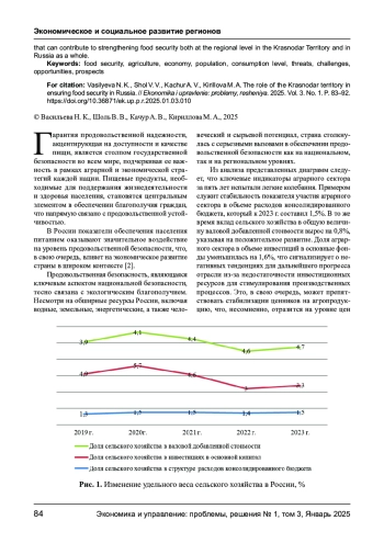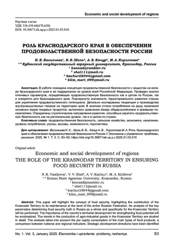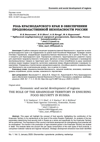 В работе освещена концепция продовольственной безопасности с акцентом на вкладе Краснодарского края в ее поддержание на уровне всей Российской Федерации. Проведен анализ ключевых параметров, определяющих продовольственную безопасность как в целом по России, так и конкретно для Краснодарского края. Подчеркнута значимость территориального развития страны для укрепления продовольственного потенциала. Детально исследованы тенденции в производстве агропромышленных товаров на территории края. В анализе учтено потребление на душу населения основных видов пищевых продуктов, выполнено сравнение между общероссийскими и краевыми показателями. Определены стратегические направления развития, способные укрепить продовольственную безопасность как на региональном уровне, так и в целом по стране.