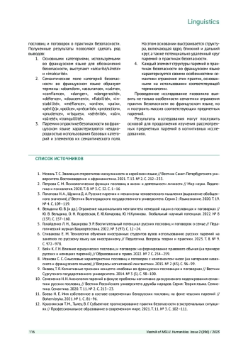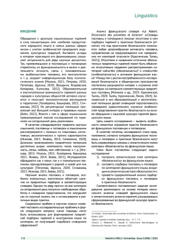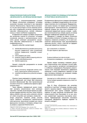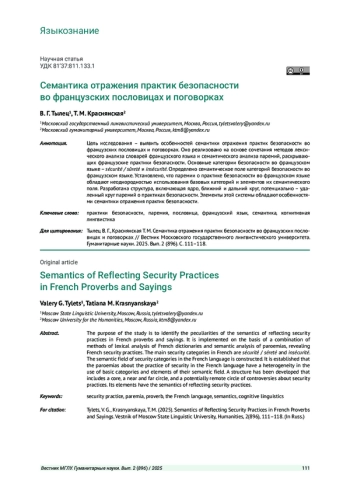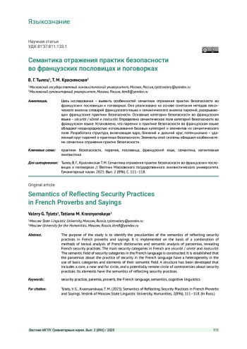 Цель исследования - выявить особенностей семантики отражения практик безопасности во французских пословицах и поговорках. Оно реализовано на основе сочетания методов лексического анализа словарей французского языка и семантического анализа паремий, раскрывающих французские практики безопасности. Основные категории безопасности во французском языке - sécurité / sûreté и insécurité. Определено семантическое поле категорий безопасности во французском языке. Установлено, что паремии о практике безопасности во французском языке обладают неоднородностью использования базовых категорий и элементов их семантического поля. Разработана структура, включающая ядро, ближний и дальний круг, потенциально - удаленный круг паремий о практиках безопасности. Элементы этой системы обладают особенностями семантики отражения практик безопасности.