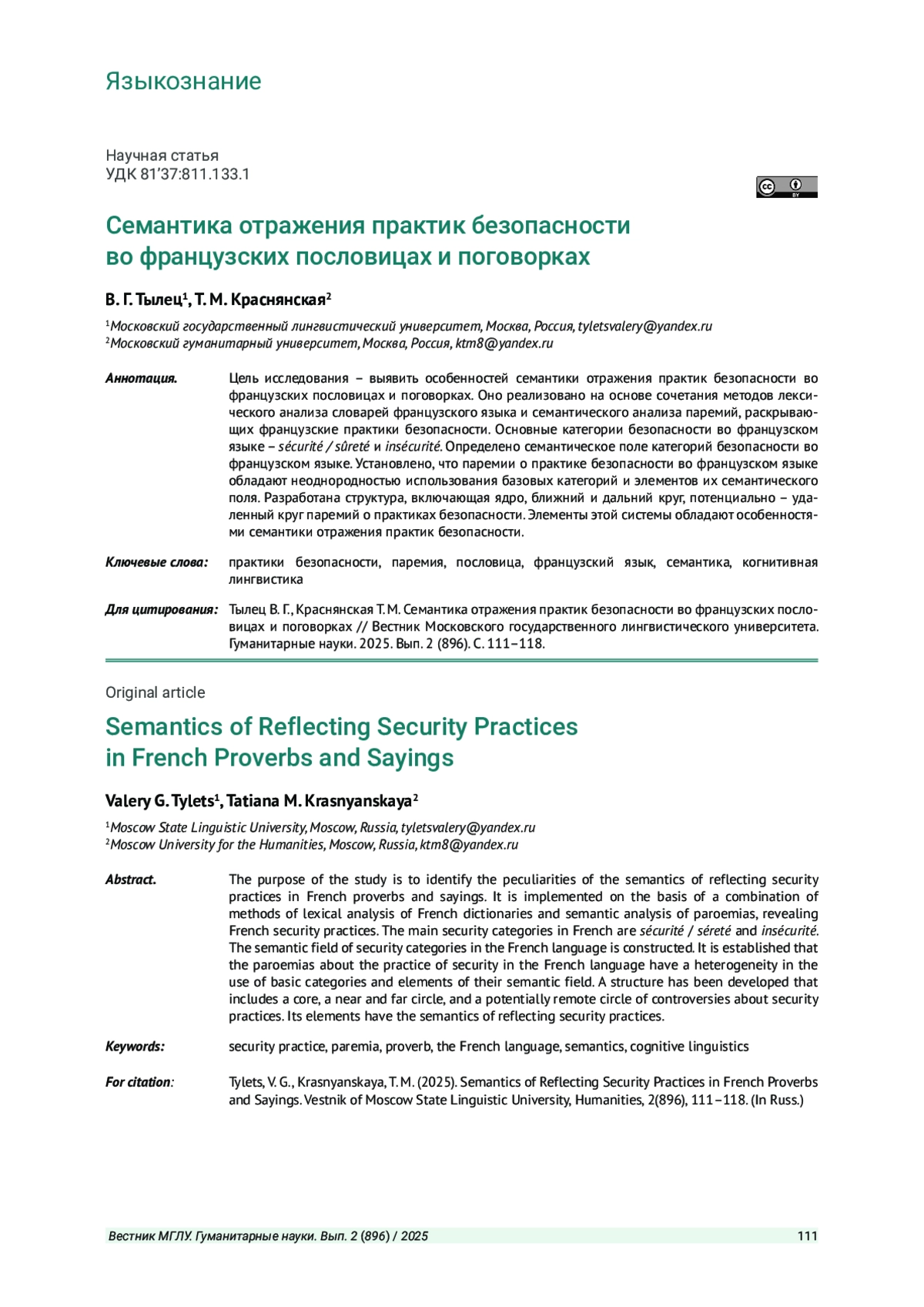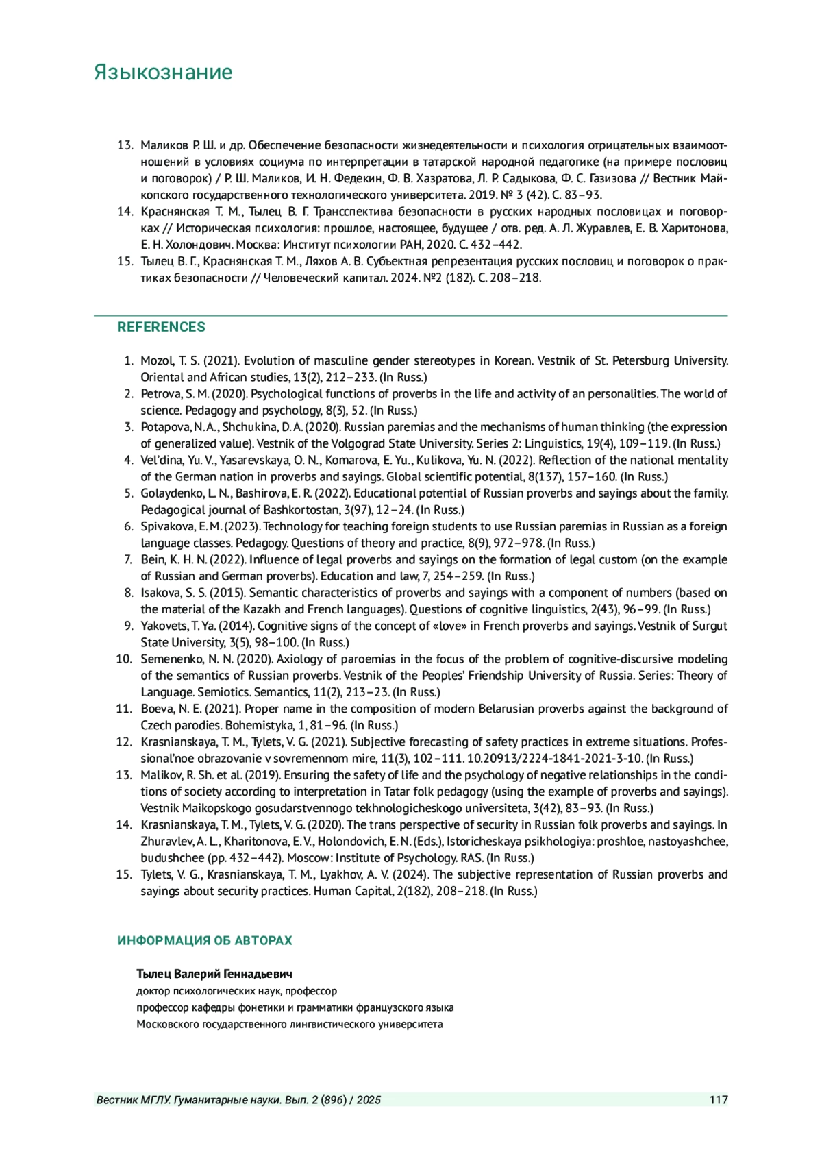 15. Тылец В. Г., Краснянская Т. М., Ляхов А. В. Субъектная репрезентация русских пословиц и поговорок о практиках безопасности // Человеческий капитал. 2024. №2 (182). С. 208-218. EDN: TLSHIN