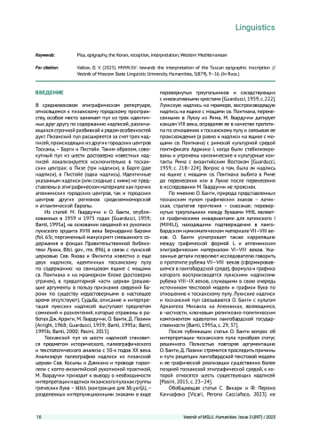 7. Vicari St., Perono Cacciafoco F. A Puzzling Religious Inscription from Medieval Tuscany: Symbology and Interpretation // Histories. 2023. # 3. 219-230. EDN: BAEAWF