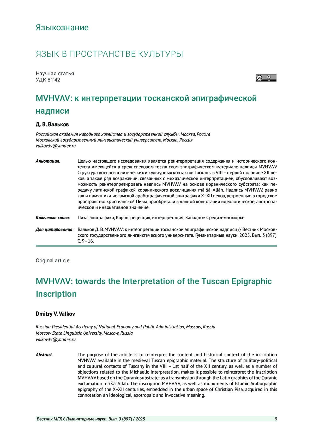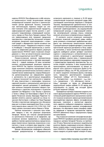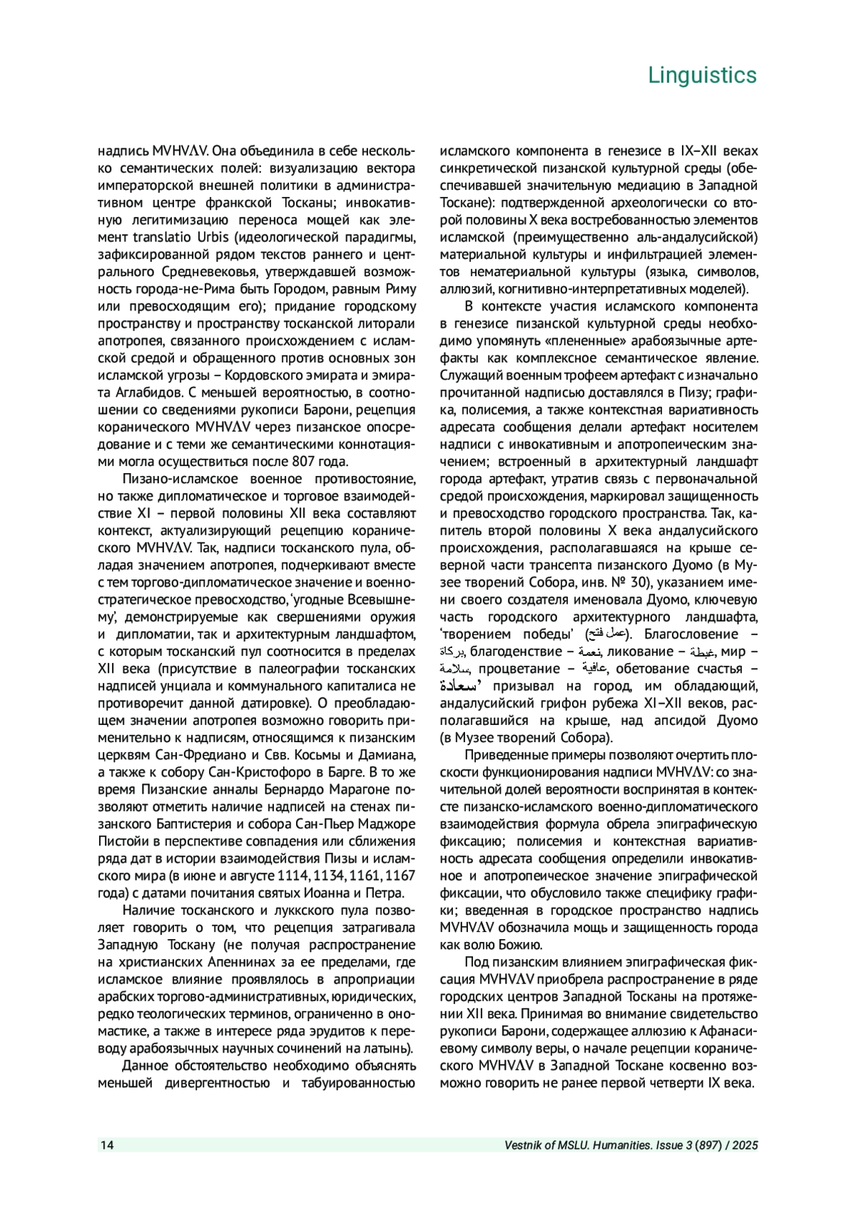 Целью настоящего исследования является реинтерпретация содержания и исторического контекста имеющейся в средневековом тосканском эпиграфическом материале надписи MVHV V. Структура военно-политических и культурных контактов Тосканы в VIII - первой половине XII веков, а также ряд возражений, связанных с михаэлической интерпретацией, обусловливают возможность реинтерпретировать надпись MVHV V на основе коранического субстрата: как передачу латинской графикой коранического восклицания mā šāʾ Allāh. Надпись MVHV V, равно как и памятники исламской арабографической эпиграфики X-XII веков, встроенные в городское пространство христианской Пизы, приобретали в данной коннотации идеологическое, апотропаическое и инвокативное значение.