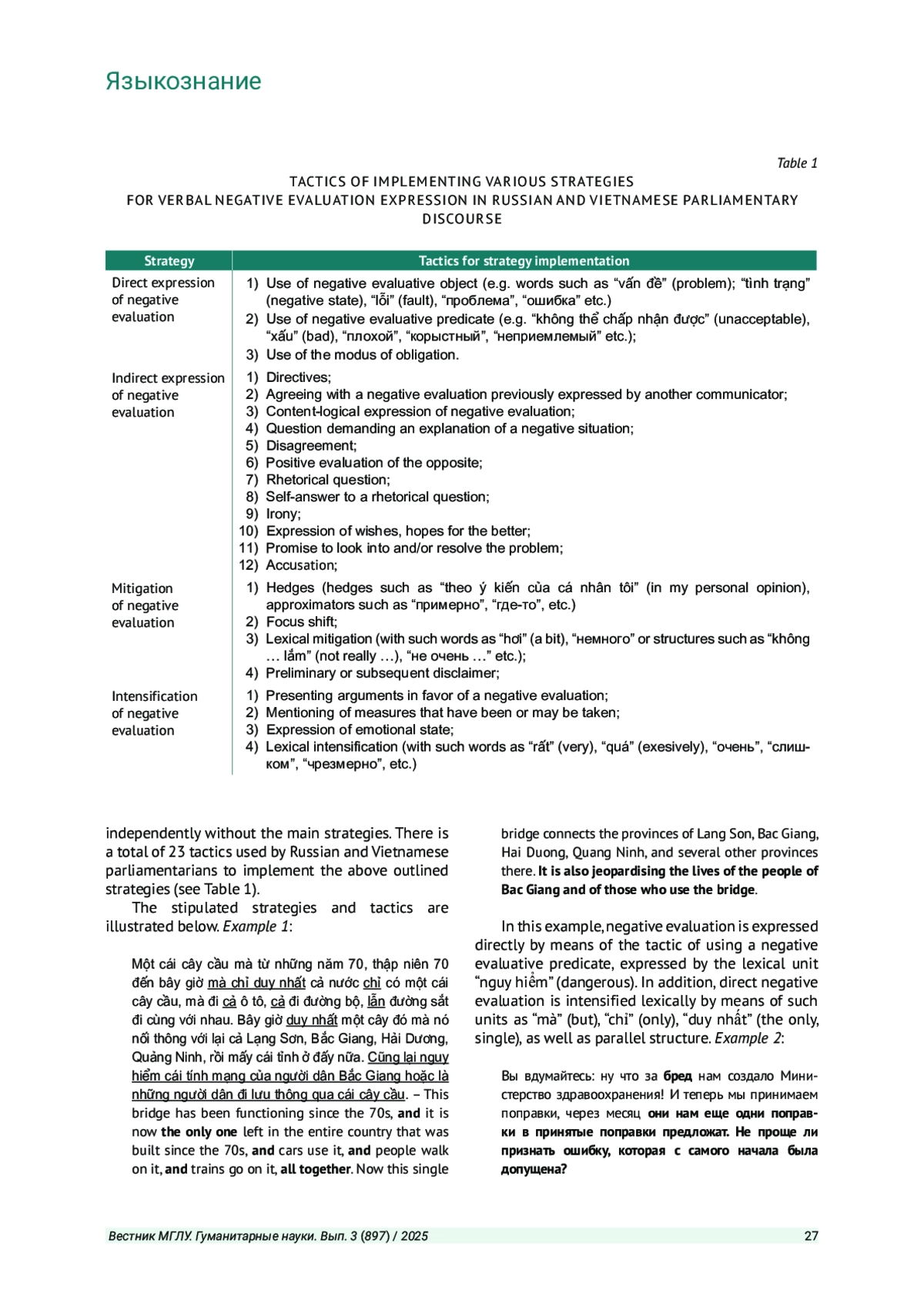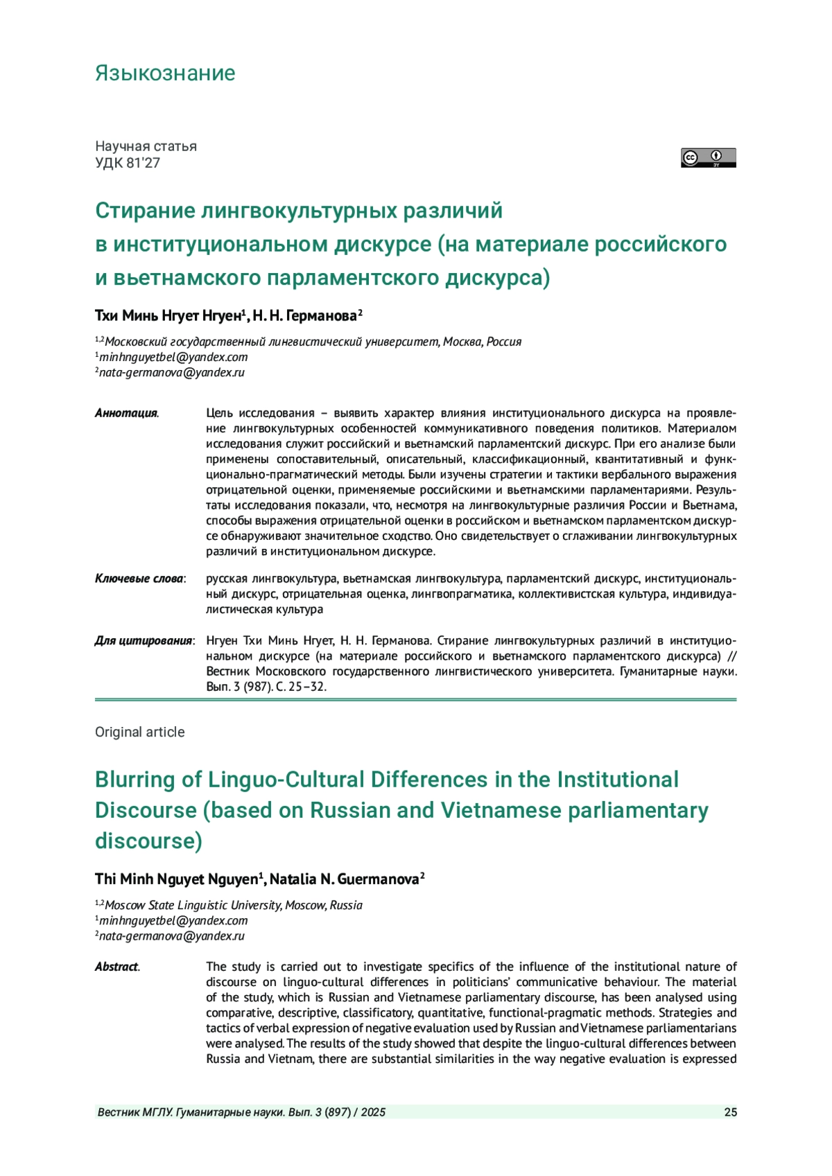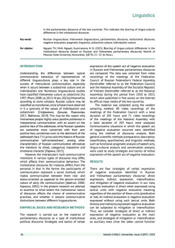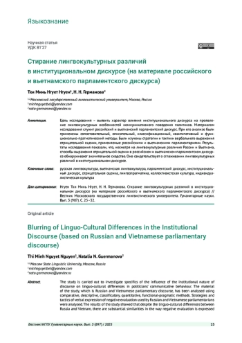 Цель исследования - выявить характер влияния институционального дискурса на проявление лингвокультурных особенностей коммуникативного поведения политиков. Материалом исследования служит российский и вьетнамский парламентский дискурс. При его анализе были применены сопоставительный, описательный, классификационный, квантитативный и функционально-прагматический методы. Были изучены стратегии и тактики вербального выражения отрицательной оценки, применяемые российскими и вьетнамскими парламентариями. Результаты исследования показали, что, несмотря на лингвокультурные различия России и Вьетнама, способы выражения отрицательной оценки в российском и вьетнамском парламентском дискурсе обнаруживают значительное сходство. Оно свидетельствует о сглаживании лингвокультурных различий в институциональном дискурсе.