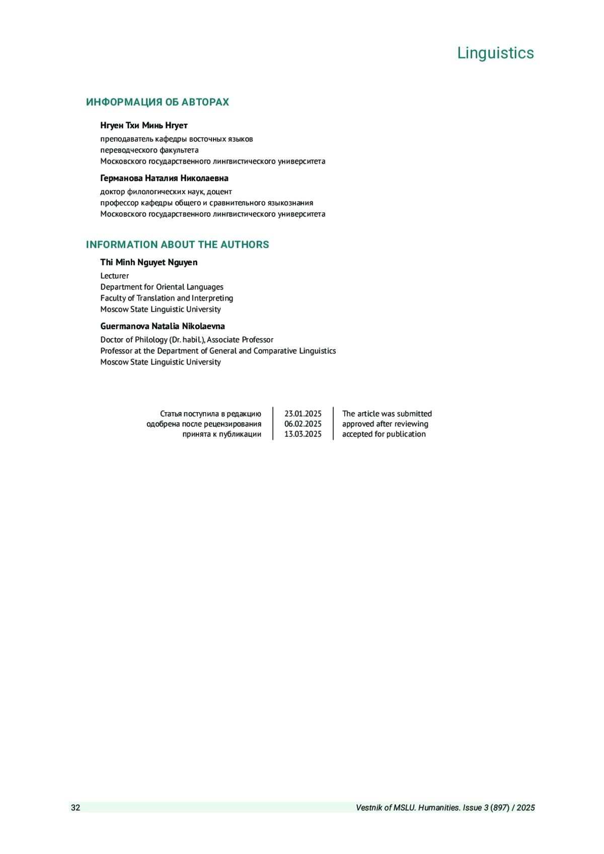 10. Нгуен Тхи Минь Нгует. Концепт ЛИЦО во вьетнамской культуре // Этнопсихолингвистика. 2022b. Вып. 4 (11). С. 53-62. DOI: 10.31249/epl/2022.04.04