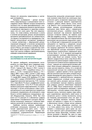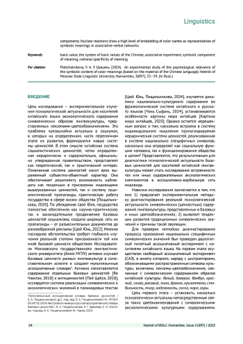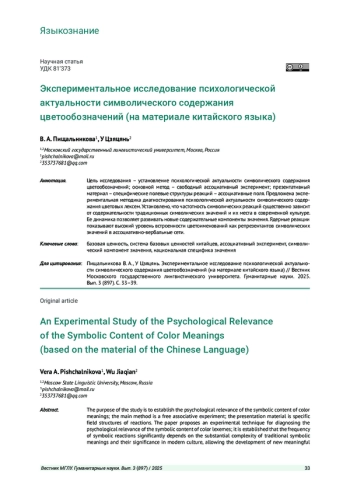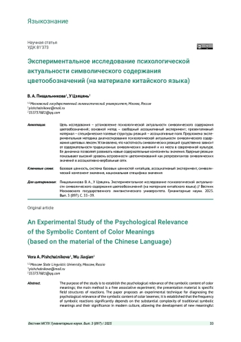 Цель исследования – экспериментальное изучение психологической актуальности для носителей китайского языка аксиологического содержания символических образов лингвокультуры, представленных лексемами-цветообозначениями. Эта проблема чрезвычайно актуальна в социумах, в которых на определенном, часто переломном этапе их развития, формируются новые системы ценностей.