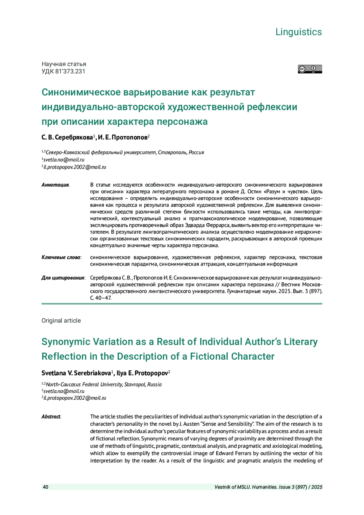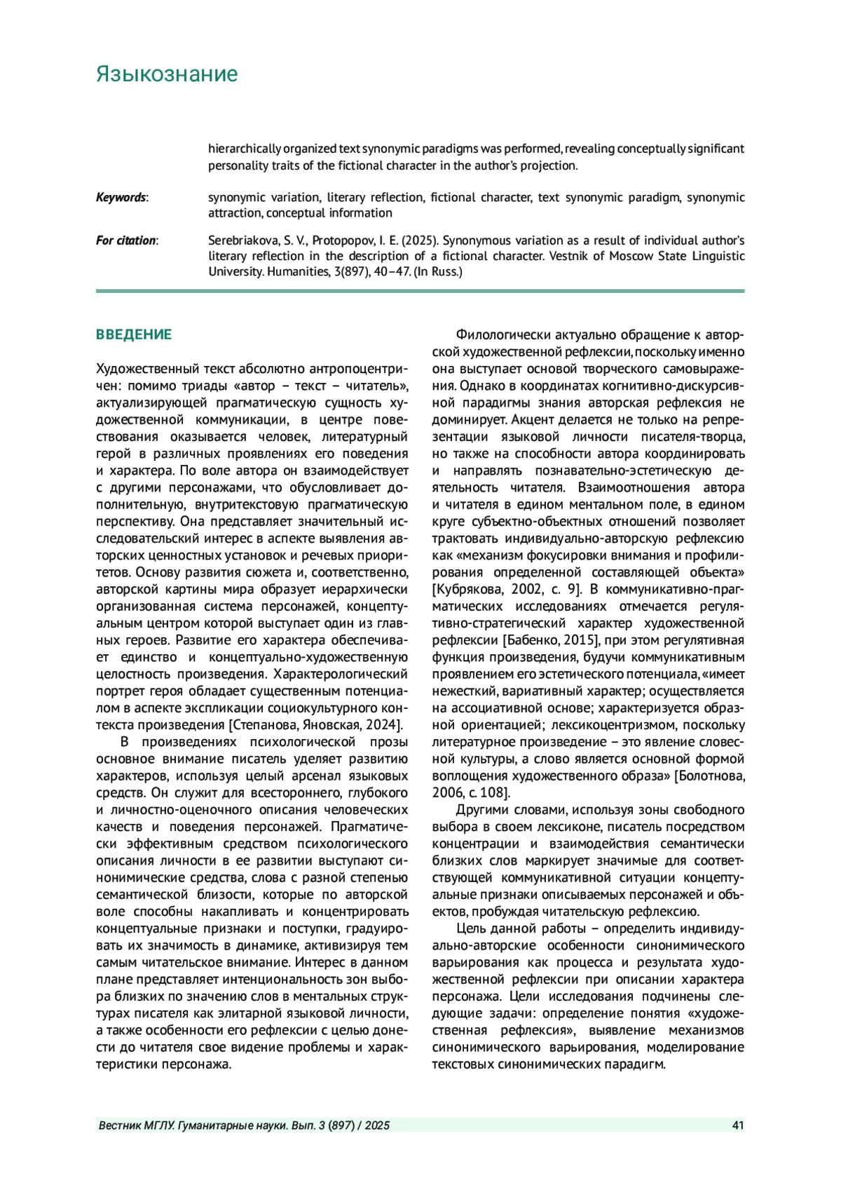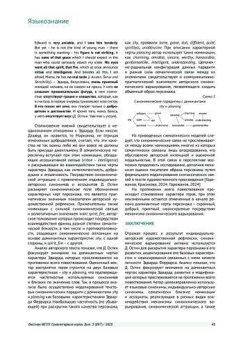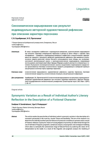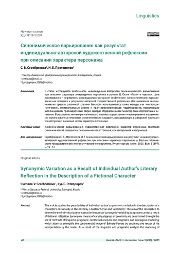 СЕРЕБРЯКОВА С. В., ПРОТОПОПОВ И. Е. СИНОНИМИЧЕСКОЕ ВАРЬИРОВАНИЕ КАК РЕЗУЛЬТАТ ИНДИВИДУАЛЬНО-АВТОРСКОЙ ХУДОЖЕСТВЕННОЙ РЕФЛЕКСИИ ПРИ ОПИСАНИИ ХАРАКТЕРА ПЕРСОНАЖА // ВЕСТНИК МОСКОВСКОГО ГОСУДАРСТВЕННОГО ЛИНГВИСТИЧЕСКОГО УНИВЕРСИТЕТА. ГУМАНИТАРНЫЕ НАУКИ. 2025. № 3 (897)