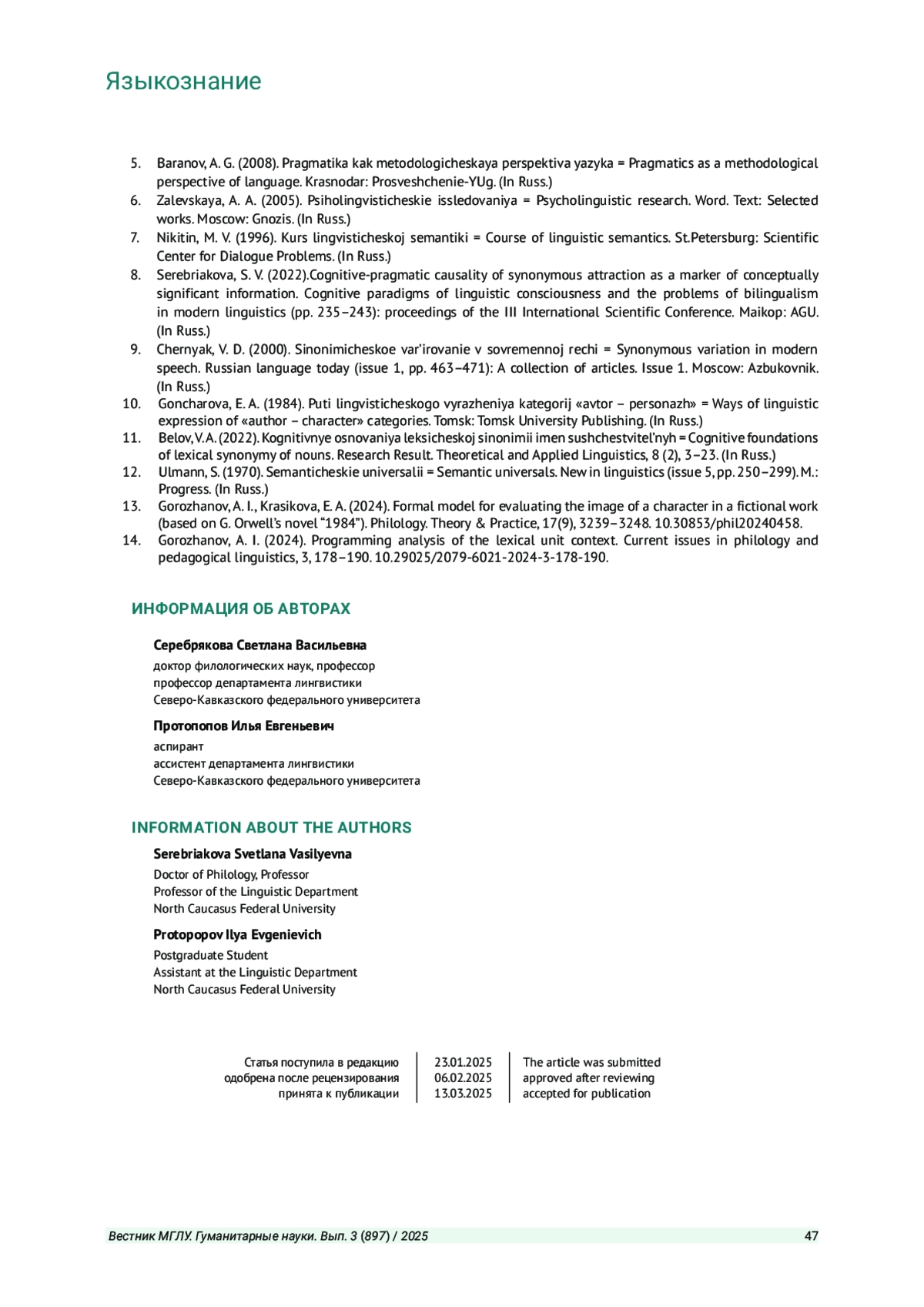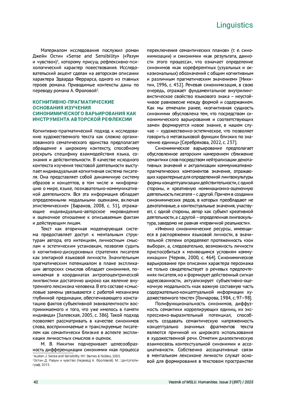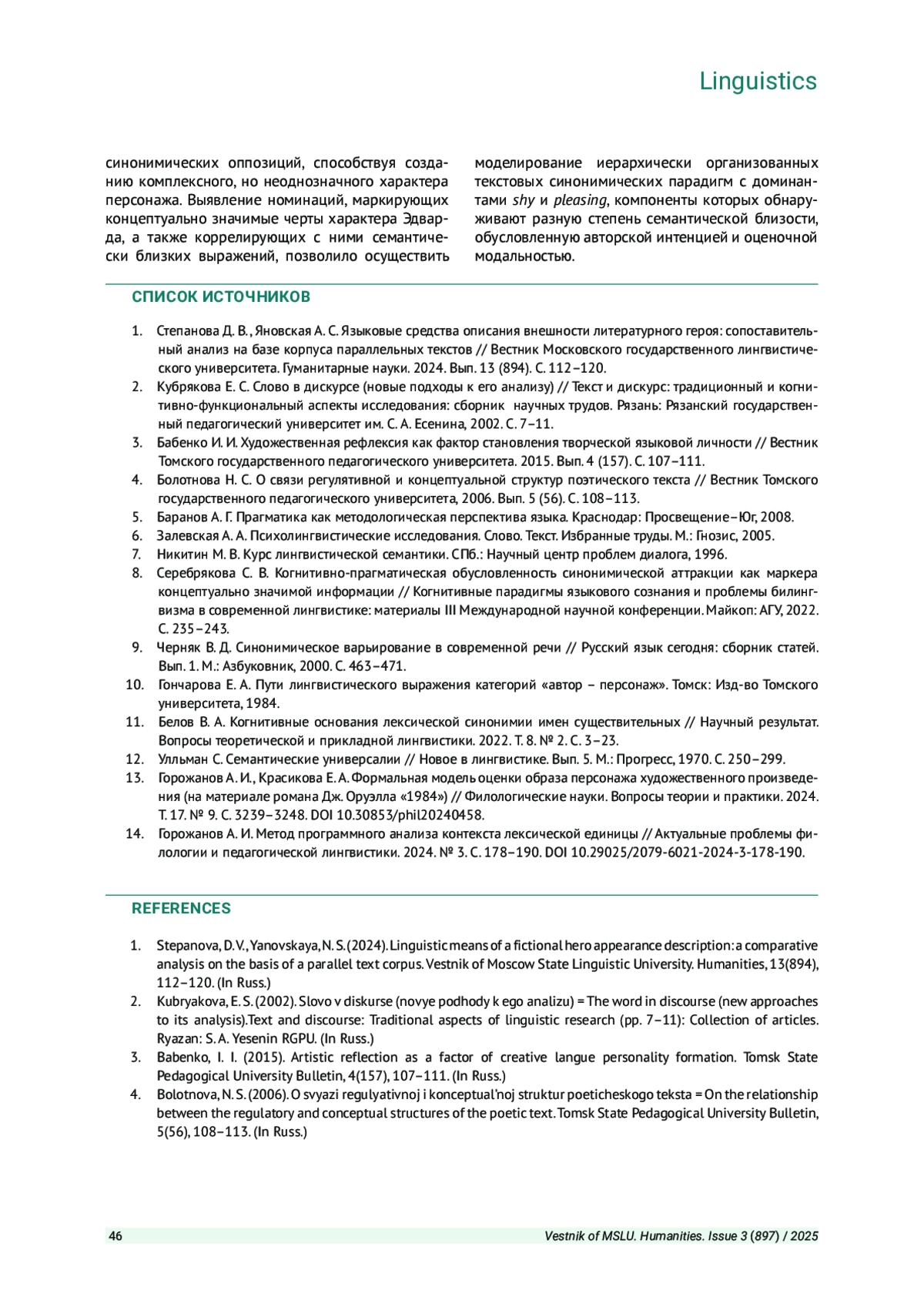 СЕРЕБРЯКОВА С. В., ПРОТОПОПОВ И. Е. СИНОНИМИЧЕСКОЕ ВАРЬИРОВАНИЕ КАК РЕЗУЛЬТАТ ИНДИВИДУАЛЬНО-АВТОРСКОЙ ХУДОЖЕСТВЕННОЙ РЕФЛЕКСИИ ПРИ ОПИСАНИИ ХАРАКТЕРА ПЕРСОНАЖА // ВЕСТНИК МОСКОВСКОГО ГОСУДАРСТВЕННОГО ЛИНГВИСТИЧЕСКОГО УНИВЕРСИТЕТА. ГУМАНИТАРНЫЕ НАУКИ. 2025. № 3 (897)