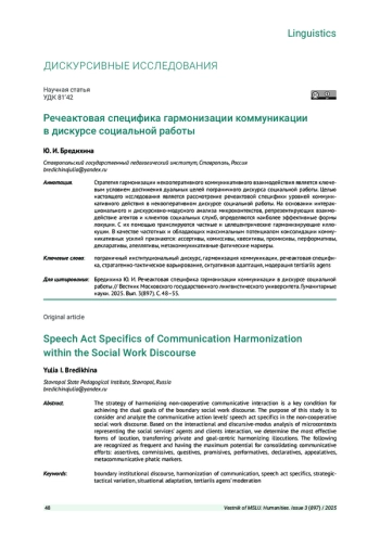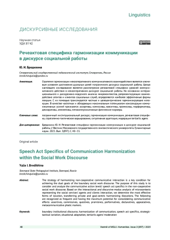 Стратегия гармонизации некооперативного коммуникативного взаимодействия является ключевым условием достижения дуальных целей пограничного дискурса социальной работы. Целью настоящего исследования является рассмотрение речеактовой специфики уровней коммуникативного действия в некооперативном дискурсе социальной работы. На основании интеракционального и дискурсивно-модусного анализа микроконтекстов, репрезентирующих взаимодействие агентов и клиентов социальных служб, определяются наиболее эффективные формы локуции. С их помощью транслируются частные и целецентрические гармонизирующие иллокуции. В качестве частотных и обладающих максимальным потенциалом консолидации коммуникативных усилий признаются: ассертивы, комиссивы, квеситивы, промисивы, перформативы, декларативы, апеллятивы, метакоммуникативные фатические маркеры.