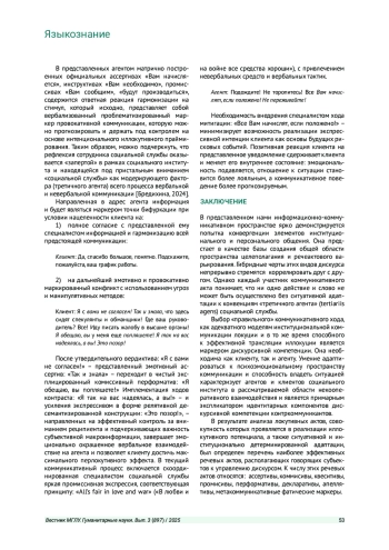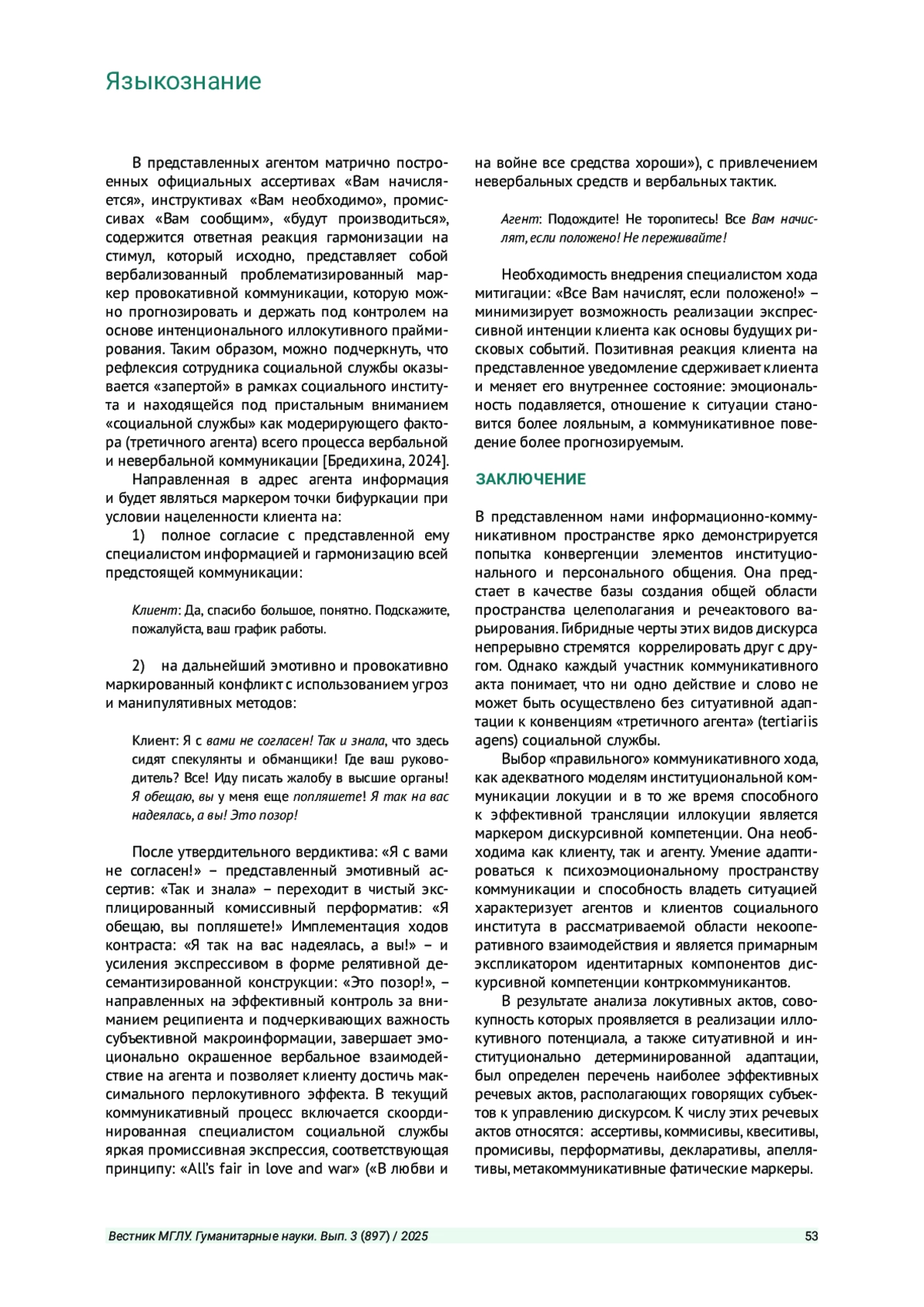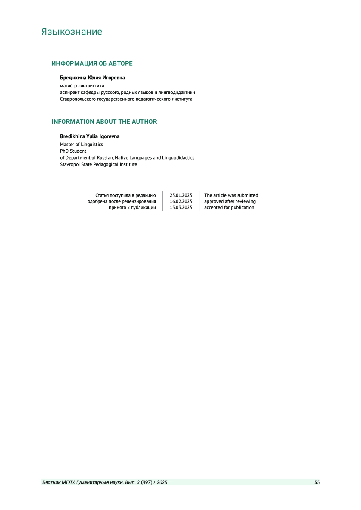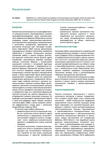 14. Бредихина Ю. И. Способы управления институциональным дискурсом посредством внедрения паралингвистических и экстралингвистических приемов невербальной коммуникации // Изоморфные и алломорфные признаки языковых систем. Ставрополь: Изд-во СКФУ, 2024. С. 41-47. EDN: PCKCTH