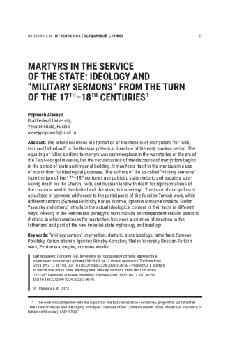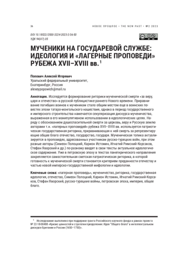Исследуется формирование риторики мученической смерти «за веру, царя и отечество» в русской публицистике раннего Нового времени. Приравнивание погибших воинов к мученикам стало общим местом еще в воинских повестях эпохи татаро-монгольского нашествия, однако в период государственного и имперского строительства намечается секуляризация дискурса мученичества, выраженная в его манипулятивном использовании в идеологических целях. Наряду с обоснованием душеспасительной смерти за церковь, веру и Русскую землю авторами т. н. «лагерных проповедей» рубежа XVII–XVIII вв. используется патриотическая государственная риторика, приравнивающая к ней смерть за репрезентирующие общее благо отечество, государство, государя. Мученическая топика актуализируется в проповедях, адресованных участникам русско-турецких войн, при этом разные авторы (Симеон Полоцкий, Карион Истомин, Игнатий Римский-Корсаков, Стефан Яворский и др.) по-разному вводят в свои тексты актуальное идеологическое содержание. Уже в петровскую эпоху в текстах панегирического направления закрепляется самостоятельная светская патриотическая риторика, в которой готовность к мученической смерти становится критерием преданности отечеству и частью новой имперско-государственной мифологии и идеологии