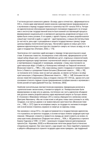 У истоков русского воинского девиза «За веру, царя и отечество», оформившегося в XIX в., стояли идеи жертвенной смерти воинов и декларативное приравнивание их к мученикам в период государственного строительства XVI–начала XVIII в. Риторико-идеологическое обоснование подчиненного положения подданного по отношению к институтам государственной власти было важной составляющей процесса формирования национального и имперского дискурсов, разделение которых в это время было очень условно. В это время, с одной стороны, активно разрабатывался новый круг понятий и идей, а с другой — адаптировались к новым обстоятельствам (в частности, речь идет о расширении и защите государственных границ) традиционные формы политической культуры. Неслучайно одним из новых для этого времени идеологических конструктов становится «смерть не только за веру, но и за царя и государство» [Попович, 2020, с. 175].