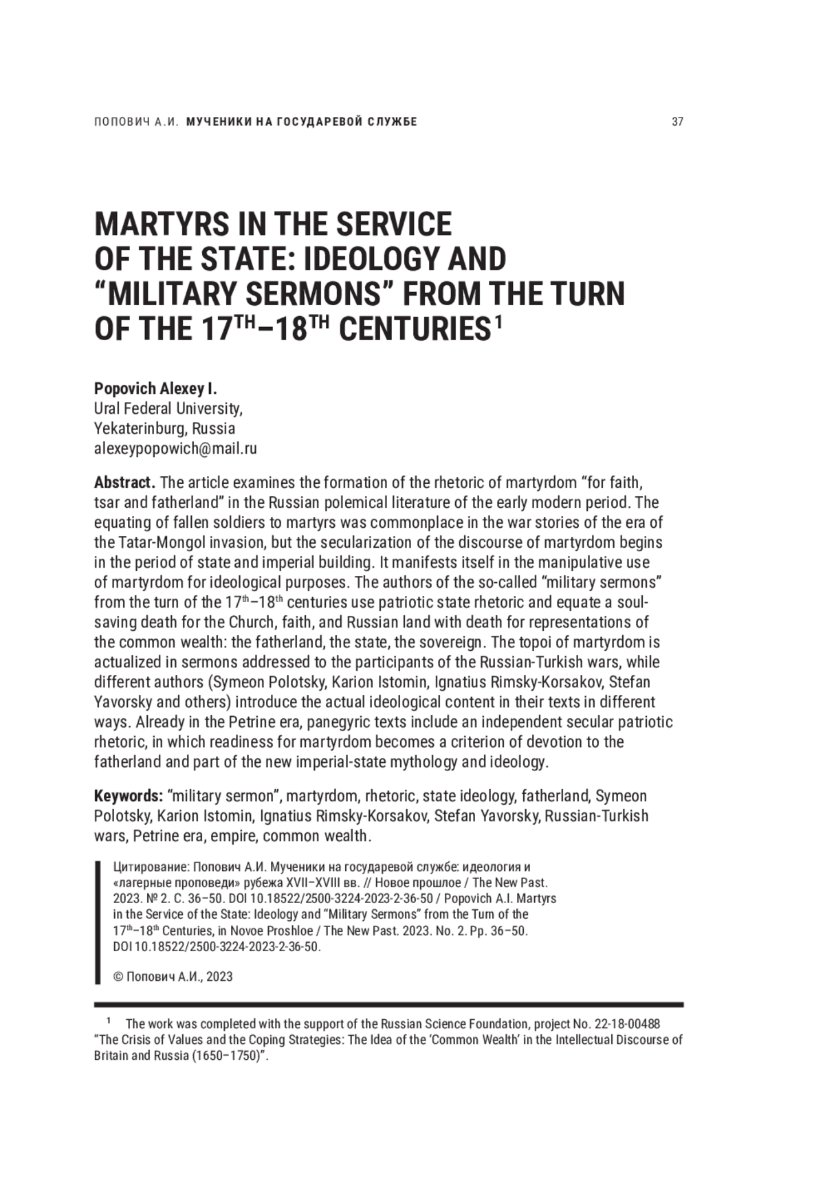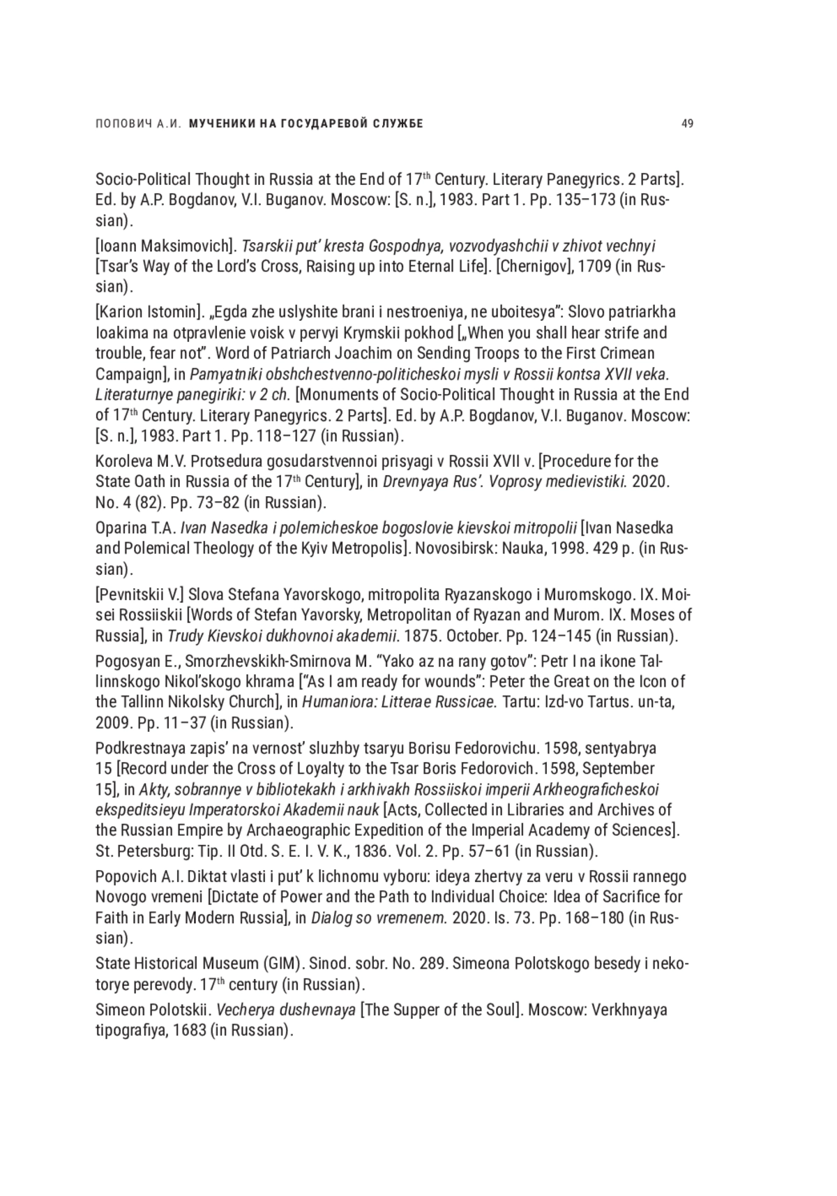 16. Попович А.И. Диктат власти и путь к личному выбору: идея жертвы за веру в России раннего Нового времени // Диалог со временем. 2020. Вып. 73. С. 168-180. DOI: 10.21267/AQUILO.2020.73.73.007 EDN: DRSSYI