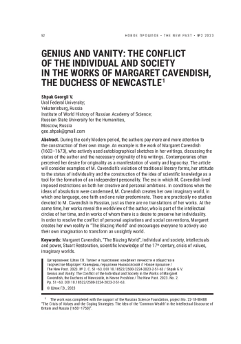 На протяжении раннего Нового времени авторы все больше внимания уделяют конструированию собственного образа. Примером может служить творчество Маргарет Кавендиш (1603–1673 гг.), активно использовавшей в своих трудах автобиографические зарисовки, рассуждающей о статусе автора и необходимой оригинальности его сочинений. Современники часто воспринимали ее стремление к оригинальности как проявление тщеславия и лицемерия. В статье будут рассмотрены примеры нарушения М. Кавендиш традиционных литературных форм, ее отношение к статусу индивидуальности и конструирование представления о научном знании как инструменте формирования независимой личности. Эпоха, в которой жила М. Кавендиш, накладывала ограничения как на творческие, так и личностные ее амбиции. В условиях, когда идеи абсолютизма порицались, М. Кавендиш создает свой воображаемый мир, в котором главенствуют один язык, одна вера и один правитель. Посвященных М. Кавендиш исследований на русском языке практически нет, как нет и переводов ее сочинений. При этом в ее работах раскрывается мировоззрение автора, вхожего в интеллектуальные круги своего времени, и прослеживается стремление сохранить свою индивидуальность. С целью решения конфликта личных устремлений и общественных условностей Маргарет создает в сочинении «Пылающий мир» свою собственную реальность и призывает всех активней использовать собственное воображение для трансформации неприглядного мира