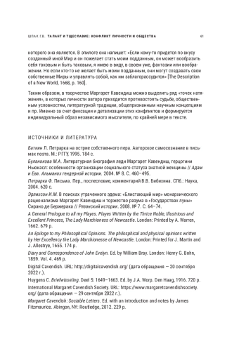 2. Буланакова М.А. Литературная биография леди Маргарет Кавендиш, герцогини Ньюкасл: особенности организации социального статуса знатной женщины // Адам и Ева. Альманах гендерной историию - М., 2004. № 8. С. 460-495. EDN: NXJRKY