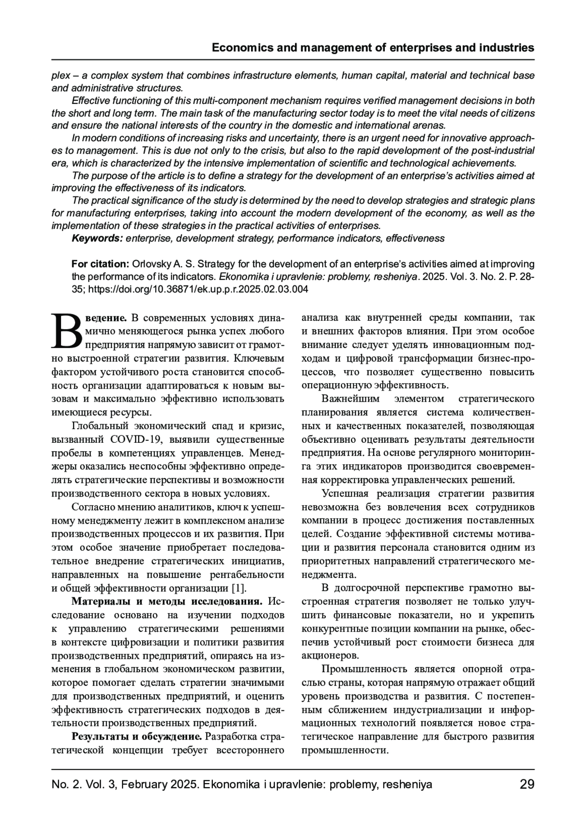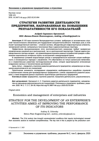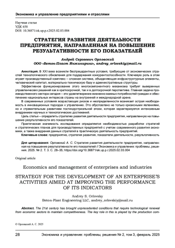 Цель статьи - определить стратегию развития деятельности предприятия, направленную на повышение результативности его показателей. Практическая значимость исследования определяется необходимостью разработки стратегий и стратегических планов для производственных предприятий с учетом современного развития экономики, а также внедрения данных стратегий в практическую деятельность предприятий.