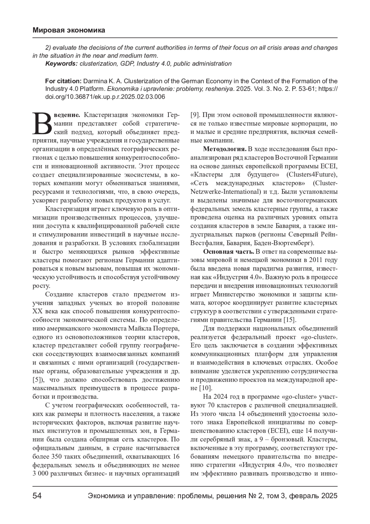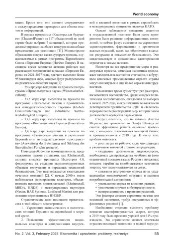 Актуальность. Одним из ключевых факторов, способствующих кластеризации немецкой экономики, является высокая степень самоорганизации участников и возможность отстаивания общих интересов на разных уровнях, включая взаимодействие с крупным бизнесом и государственными структурами. Тем не менее, несмотря на предпринимаемые меры и реализуемые проекты, немецкая экономика сталкивается со стагнацией, и в будущем ведущие и перспективные промышленные сектора Германии могут оказаться в сложной ситуации.