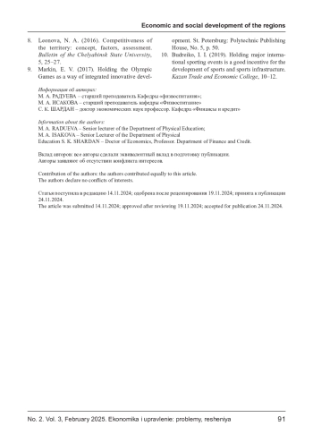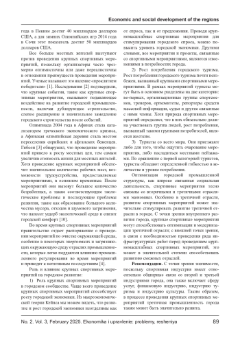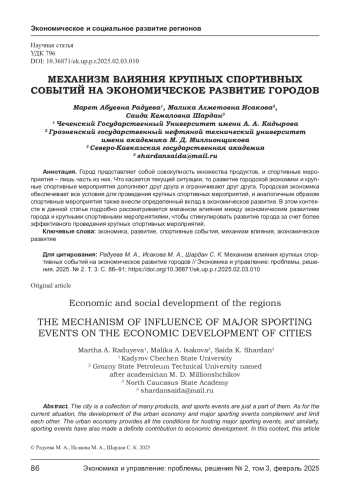 РАДУЕВА М. А., ИСАКОВА М. А., ШАРДАН С. К. МЕХАНИЗМ ВЛИЯНИЯ КРУПНЫХ СПОРТИВНЫХ СОБЫТИЙ НА ЭКОНОМИЧЕСКОЕ РАЗВИТИЕ ГОРОДОВ // ЭКОНОМИКА И УПРАВЛЕНИЕ: ПРОБЛЕМЫ, РЕШЕНИЯ. 2025. ТОМ 3 № 2