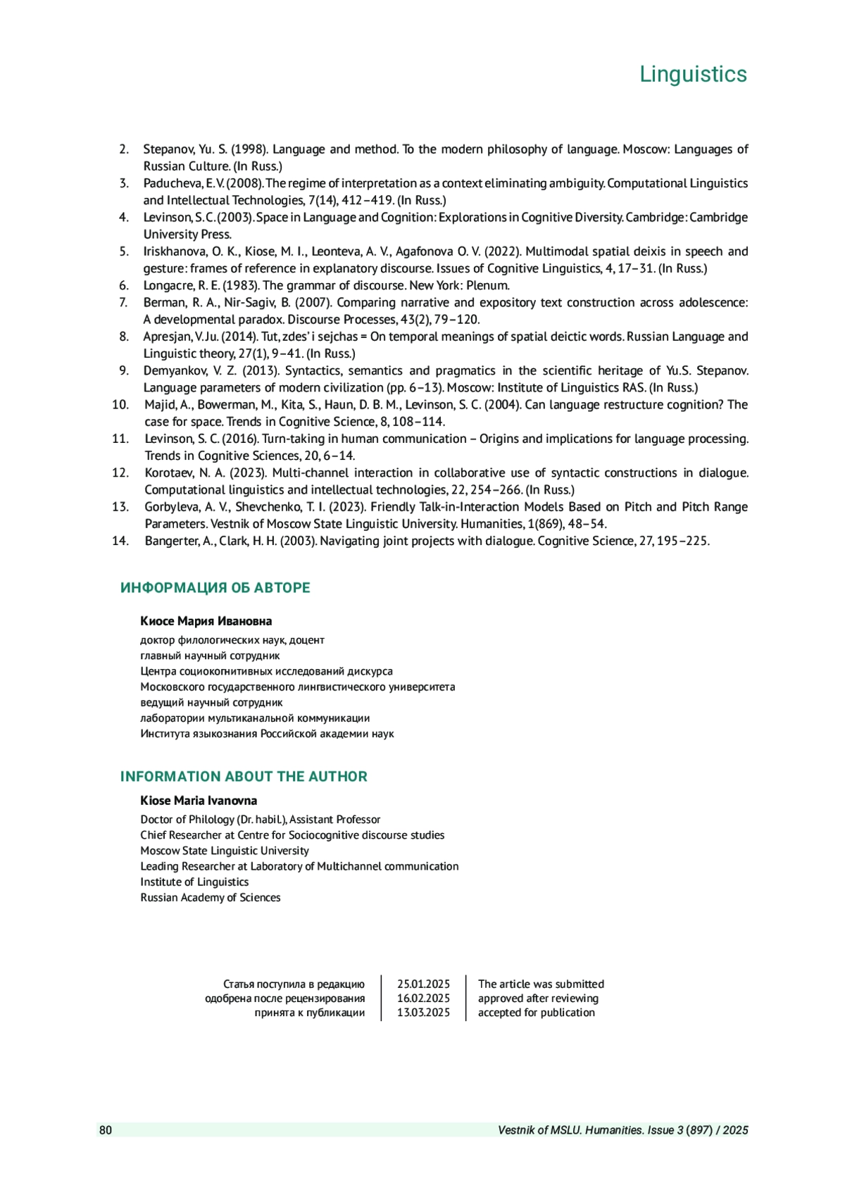 КИОСЕ М. И. ПРОСТРАНСТВЕННЫЙ ДЕЙКСИС В СПОНТАННОМ ЭКСПОЗИТОРНОМ ДИАЛОГЕ: ЭКСПЕРИМЕНТАЛЬНОЕ ИССЛЕДОВАНИЕ // ВЕСТНИК МОСКОВСКОГО ГОСУДАРСТВЕННОГО ЛИНГВИСТИЧЕСКОГО УНИВЕРСИТЕТА. ГУМАНИТАРНЫЕ НАУКИ. 2025. № 3 (897)