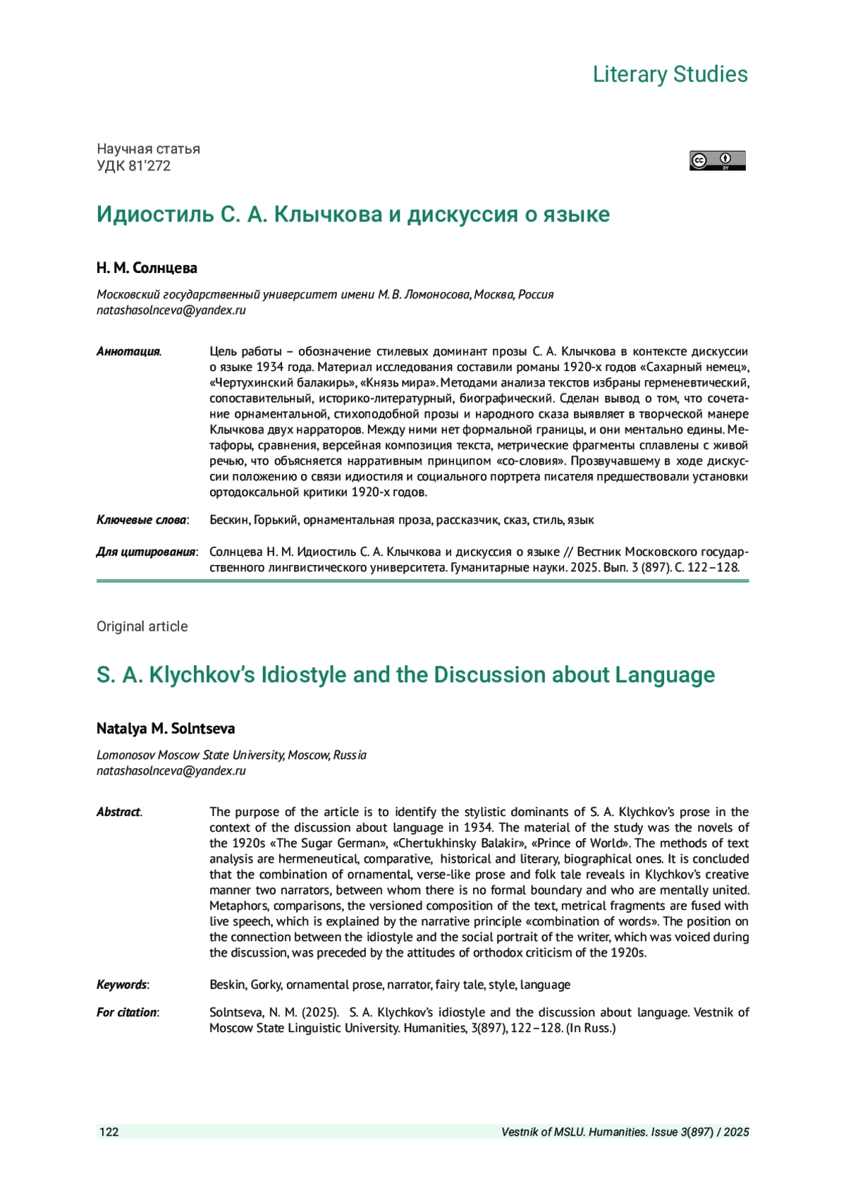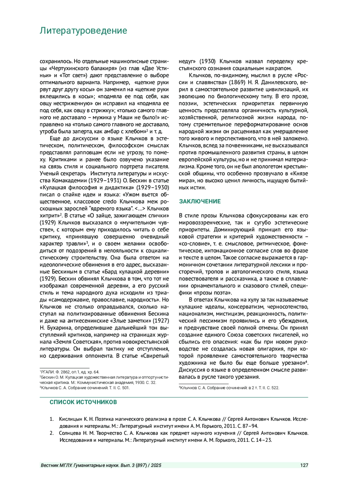 2. Солнцева Н. М. Творчество С. А. Клычкова как предмет научного изучения // Сергей Антонович Клычков. Исследования и материалы. М.: Литературный институт имени А. М. Горького, 2011. С. 14-23.