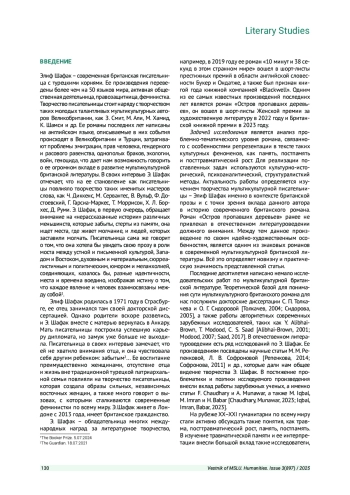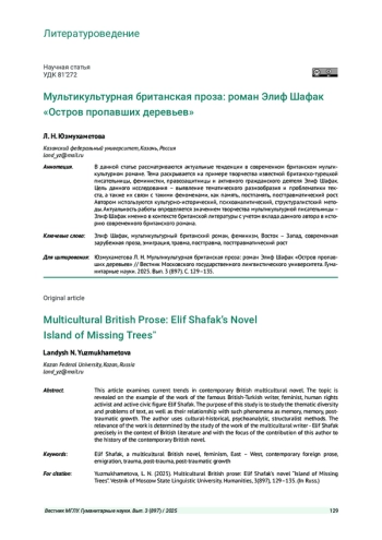 В данной статье рассматриваются актуальные тенденции в современном британском мультикультурном романе. Тема раскрывается на примере творчества известной британско-турецкой писательницы, феминистки, правозащитницы и активного гражданского деятеля Элиф Шафак. Цель данного исследования - выявление тематического разнообразия и проблематики текста, а также их связи с такими феноменами, как память, постпамять, посттравматический рост. Автором используются культурно-исторический, психоаналитический, структуралистский методы. Актуальность работы определяется значением творчества мультикультурной писательницы - Элиф Шафак именно в контексте британской литературы с учетом вклада данного автора в историю современного британского романа.