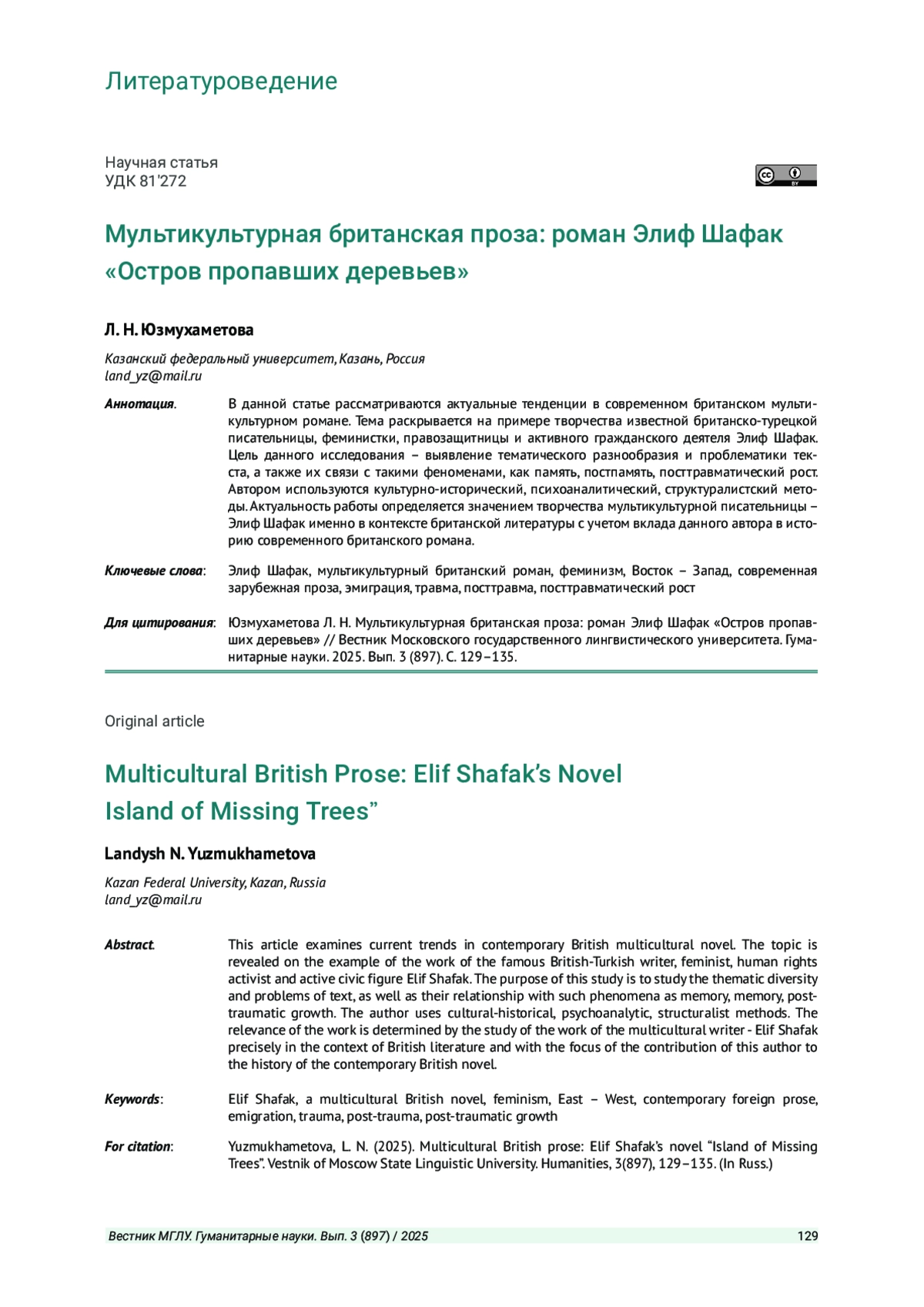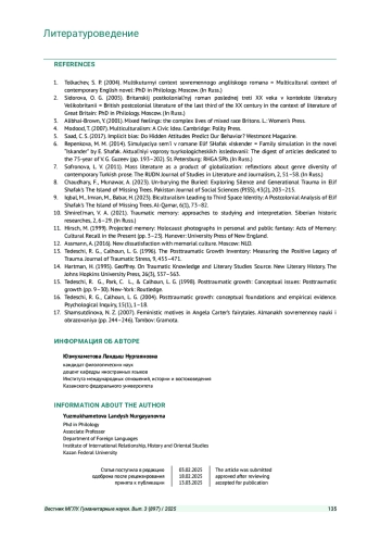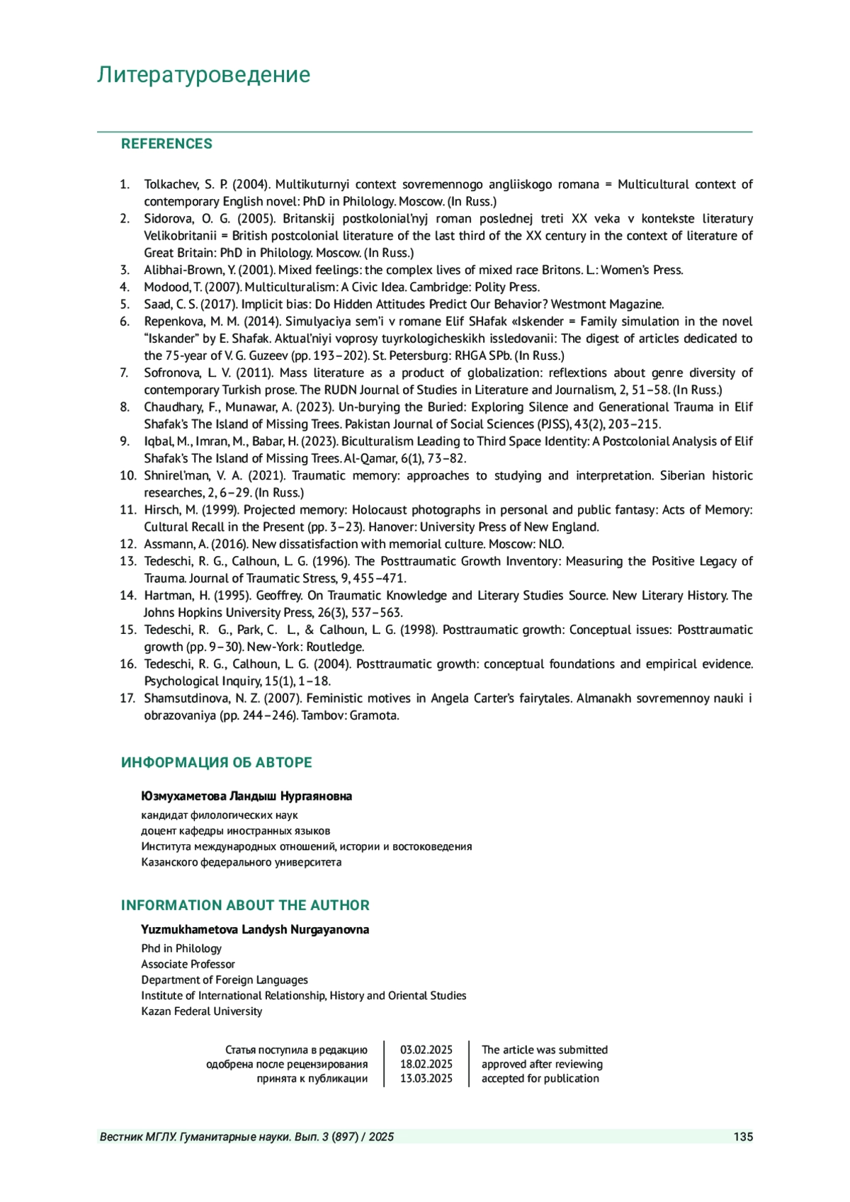 8. Chaudhary F., Munawar A. Un-burying the Buried: Exploring Silence and Generational Trauma in Elif Shafak’s The Island of Missing Trees // Pakistan Journal of Social Sciences (PJSS). 2023. Vol. 43. № 2. P. 203-215.