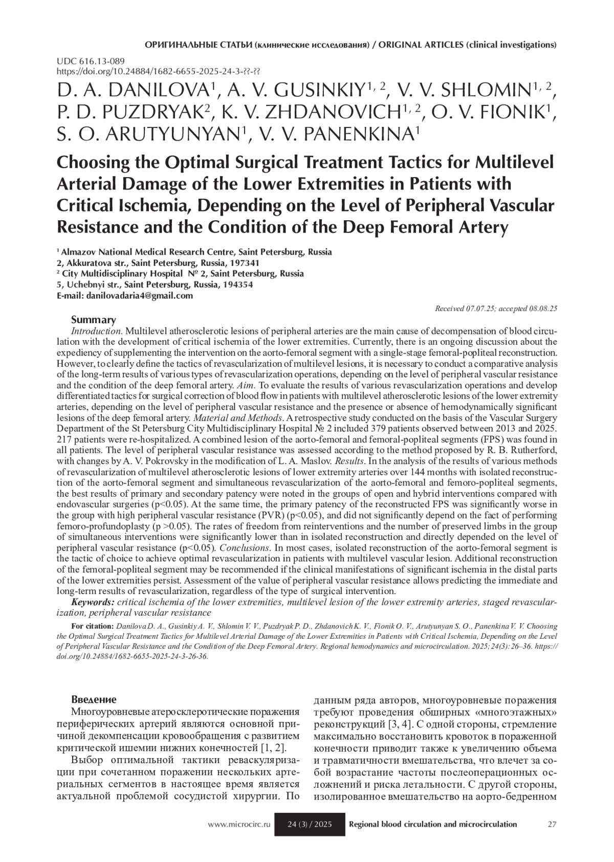 ДАНИЛОВА Д. А., ГУСИНСКИЙ А. В., ШЛОМИН В. В., ПУЗДРЯК П. Д., ЖДАНОВИЧ К. В., ФИОНИК О. В., АРУТЮНЯН С. О., ПАНЕНКИНА В. В. ВЫБОР ОПТИМАЛЬНОЙ ТАКТИКИ ХИРУРГИЧЕСКОГО ЛЕЧЕНИЯ ПРИ МНОГОУРОВНЕВЫХ ПОРАЖЕНИЯХ АРТЕРИЙ НИЖНИХ КОНЕЧНОСТЕЙ У ПАЦИЕНТОВ С КРИТИЧЕСКОЙ ИШЕМИЕЙ В ЗАВИСИМОСТИ ОТ УРОВНЯ ПЕРИФЕРИЧЕСКОГО СОСУДИСТОГО СОПРОТИВЛЕНИЯ И СОСТОЯНИЯ ГЛУБОКОЙ АРТЕРИИ БЕДРА // РЕГИОНАРНОЕ КРОВООБРАЩЕНИЕ И МИКРОЦИРКУЛЯЦИЯ. 2025. № 3 (95), ТОМ 24