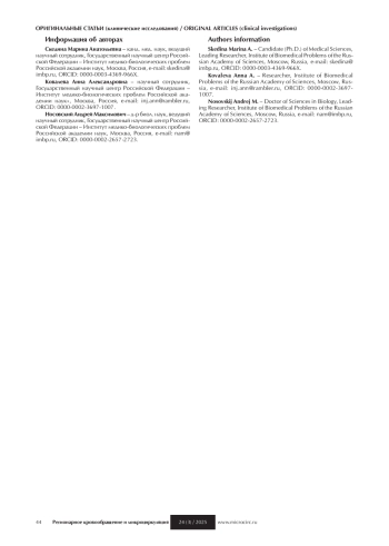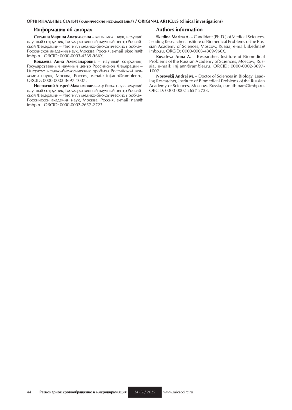15. Скедина M. A., Ковалева А. А., Носовский А. М. Анализ показателей кровотока в микроциркуляторном русле кожи человека и их связь с показателями центральной гемодинамики // Регионарное кровообращение и микроциркуляция. 2020. Т. 19, №4. C. 76-86.