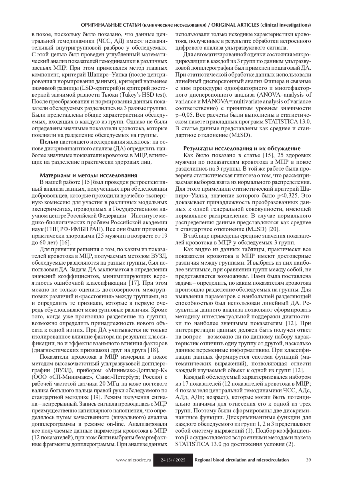 Введение. Изменения параметров микроциркуляторного русла (МЦР) являются наиболее чувствительными предикторами, которые первыми реагируют на патогенные факторы до появления клинических симптомов. При сравнении линейных и объемных показателей кровотока в МЦР, получаемых методом высокочастотной ультразвуковой допплерографии (ВУЗД), у 25 здоровых лиц в покое методом главных компонент показатели обследуемых разделились на 3 группы. Цель – на основе дискриминантного анализа (ДА) определить наиболее значимые показатели кровотока в МЦР, влияющие на разделение практически здоровых лиц. Материалы и методы. На основе подобранных дискриминантных функций были сформированы три классификационные функции, куда вошли только те характеристики, которые повлияли на разделение обследуемых. К ним относятся: максимальная линейная систолическая скорость Vs, максимальная линейная средняя скорость Vm, средняя объемная систолическая скорость Qas, максимальная линейная диастолическая скорость Vd. Результаты. По показателям кровотока в МЦР обследуемые разделились на группы: в 1-й группе следующие показатели кровотока были ниже границы доверительного интервала (ГДИ) (Vs=1,12 см/с, Vm=0,77 см/с, Vd=0,39 см/с), а Qas=0,55 мл/ мин – выше ГДИ. Для 2-й группы характерны высокие значения Vm и Vd (выше 1,26 см/с и 0,9 см/с соответственно) при значении Qas ниже 0,229 мл/мин, показатель Vs находится в пределах ГДИ. Группа 3 характеризуется значениями: Vs=1,89 см/с (выше ГДИ), Vd= 0,42 см/с (ниже ГДИ), Vm и Qas в ГДИ (1,17 см/с, 0,28 мл/мин соответственно).