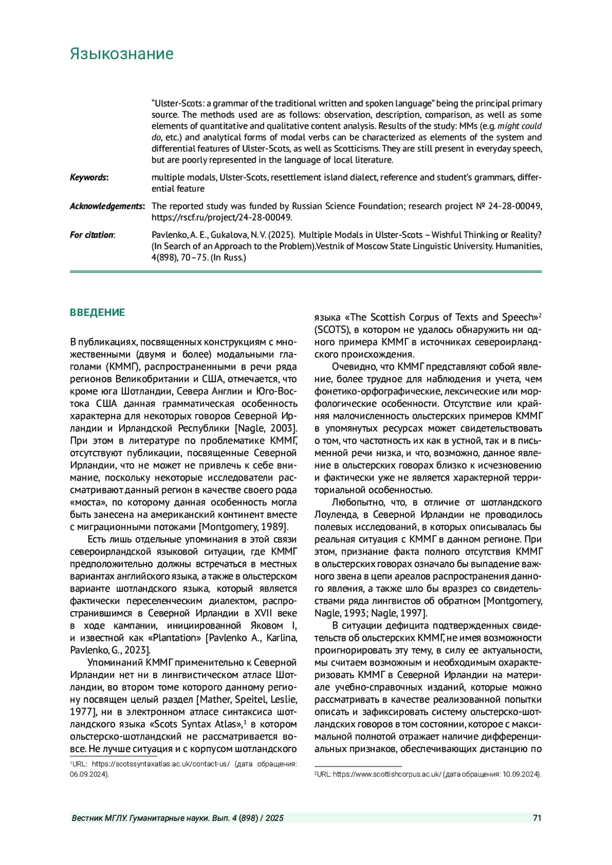 Цель исследования - оценить, в какой мере конструкции с множественными модальными глаголами и аналитические формы модальных глаголов в ольстерско-шотландском диалекте освещаются в справочно-учебных грамматиках и могут ли данные феномены рассматриваться как дифференциальные признаки системы этого идиома. Материалом исследования послужили грамматики и описания шотландского языка, при этом, в качестве основного источника была отобрана работа Ф. С. Робинсона «Ulster-Scots: a grammar of the traditional written and spoken language». Использовались методы наблюдения, описания, сравнения, а также элементы количественного и качественного контент-анализа. Результаты исследования: конструкции с множественными модальными глаголами (might could do и др.) и аналитические формы модальных глаголов являются элементами системы и дифференциальными признаками описываемого идиома, а также могут быть охарактеризованы как шотландизмы. Они присутствуют в обиходной речи, но в языке литературы представлены слабо.