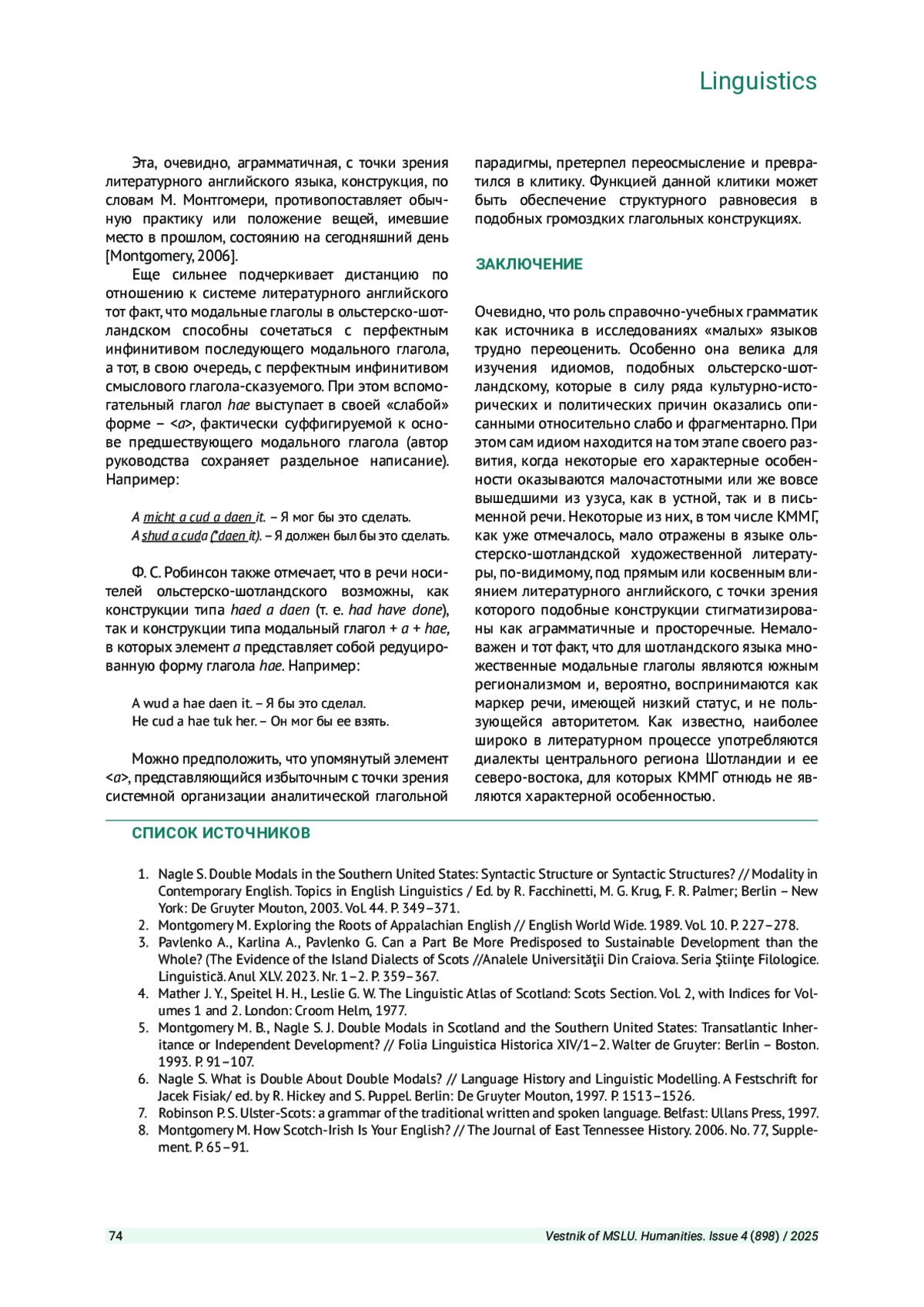 5. Montgomery M. B., Nagle S. J. Double Modals in Scotland and the Southern United States: Transatlantic Inheritance or Independent Development? // Folia Linguistica Historica XIV/1-2. Walter de Gruyter: Berlin - Boston. 1993. P. 91-107.