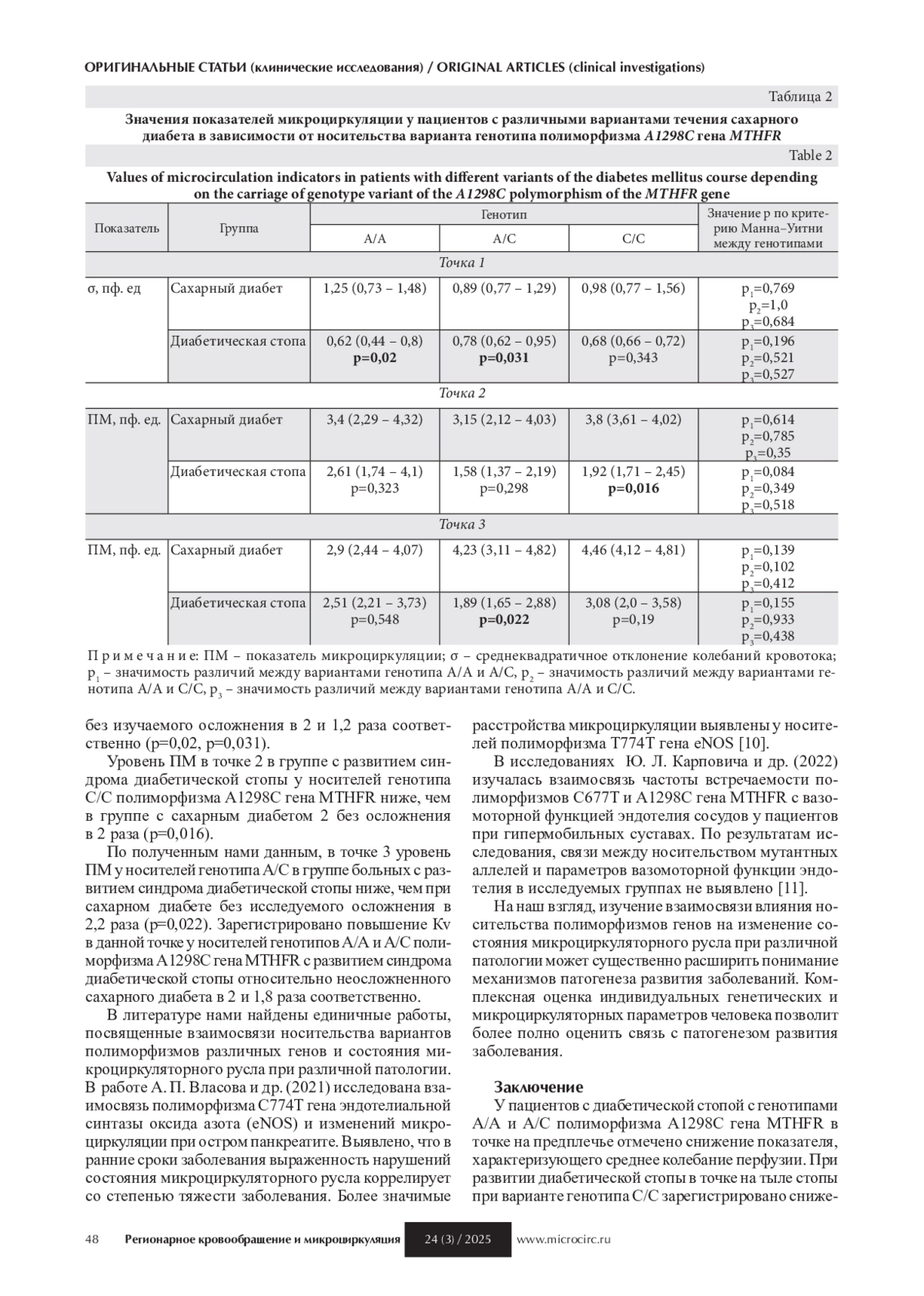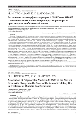 Введение. Сахарный диабет 2 типа занимает лидирующие позиции в структуре заболеваний неинфекционного происхождения в мире. Развитие тяжелых сосудистых осложнений заболевания, к которым относится синдром диабетической стопы, требует сложного лечения и является экономически затратным процессом, сопровождающимся высокой инвалидизацией и смертностью больных. Цель – оценить ассоциацию полиморфных маркеров A1298C гена MTHFR с изменениями микроциркуляторного русла при развитии диабетической стопы. Материалы и методы. На 1-м этапе исследования у 198 пациентов с неосложненным сахарным диабетом 2 типа и 199 пациентов с диабетической стопой изучали распределение генотипов полиморфизма A1298C гена MTHFR. На 2-м этапе исследования из общих групп больных выделили по 30 человек с сопоставимым в процентном соотношении распределением частот изучаемого полиморфизма как на 1-м этапе, у которых исследовали состояние микроциркуляции методом лазерной допплеровской флоуметрии. На 3-м этапе исследования проанализированы показатели микроциркуляции в зависимости от носительства генотипа полиморфизма A1298C гена MTHFR. Результаты. У больных с синдромом диабетической стопы, носителей генотипов А/А и А/C, в отдаленной точке выявлено уменьшение временной изменчивости перфузии в 2 и 1,2 раза. Локально у пациентов с изучаемым осложнением сахарного диабета 2 типа и генотипами С/C, А/C отмечается ухудшение общего состояния микроциркуляторного русла в 2 и 2,2 раза. Зарегистрировано снижение вариабельности микрокровотока в точке на 1 пальце стопы при синдроме диабетической стопы с носительством генотипов А/А и А/C в 2 и 1,8 раза. Заключение. Носительство разных вариантов генотипов полиморфизма A1298C гена MTHFR ассоциировано с разными путями реализации механизмов нарушения состояния микроциркуляторного русла.