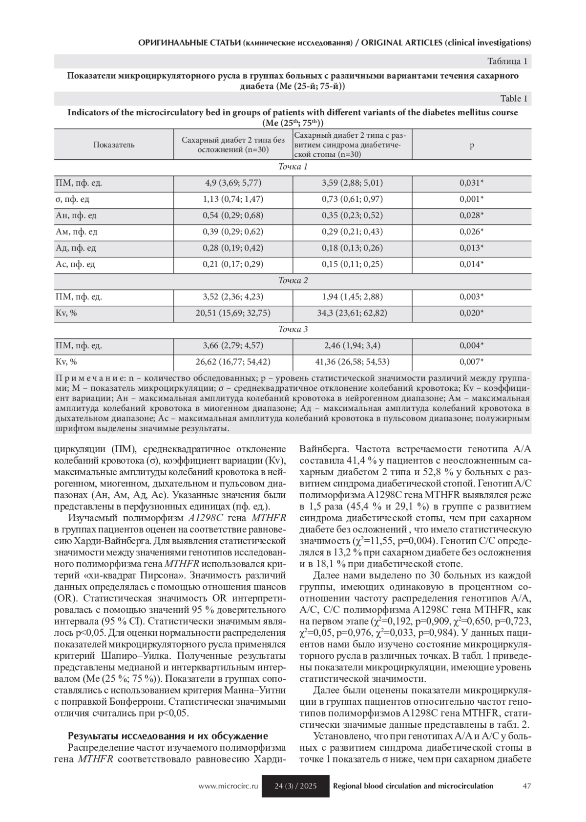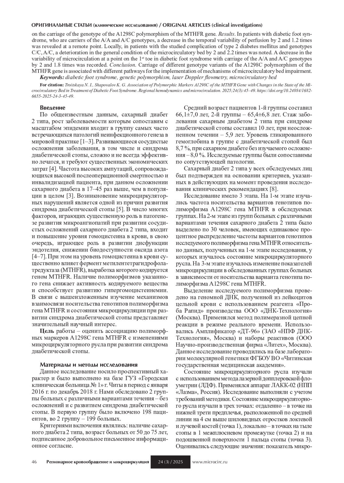 По общеизвестным данным, сахарный диабет 2 типа, рост заболеваемости которым сопоставим с масштабом эпидемии входит в группу самых часто встречающихся патологий неинфекционного генеза в мировой практике [1–3]. Развивающиеся сосудистые осложнения заболевания, в том числе и синдрома диабетической стопы, сложно и не всегда эффективно лечатся, и требуют существенных экономических затрат [4]. Частота высоких ампутаций, сопровождающихся высокой послеоперационной смертностью и инвалидизацией пациента, при данном осложнении сахарного диабета в 17–45 раз выше, чем в популяции в целом [3]. Возникновение микроциркуляторных нарушений является одной из причин развития синдрома диабетической стопы [5]. В число многих факторов, играющих существенную роль в патогенезе развития микроангиопатий при развитии сосудистых осложнений сахарного диабета 2 типа, входит и повышение уровня гомоцистеина в крови, в свою очередь, играющее роль в развитии дисфункции эндотелия, снижении биодоступности оксида азота [4–7]. При этом на уровень гомоцистеина в крови существенно влияет фермент метилентетрагидрофолатредуктаза (MTHFR), выработка которого кодируется геном MTHFR. Наличие полиморфизмов указанного гена снижает активность кодируемого вещества и способствует развитию гипергомоцистеинемии. В связи с вышеизложенным изучение механизмов взаимосвязи носительства генотипов полиморфизма гена MTHFR и состояния микроциркуляции при развитии синдрома диабетической стопы представляет значительный научный интерес.